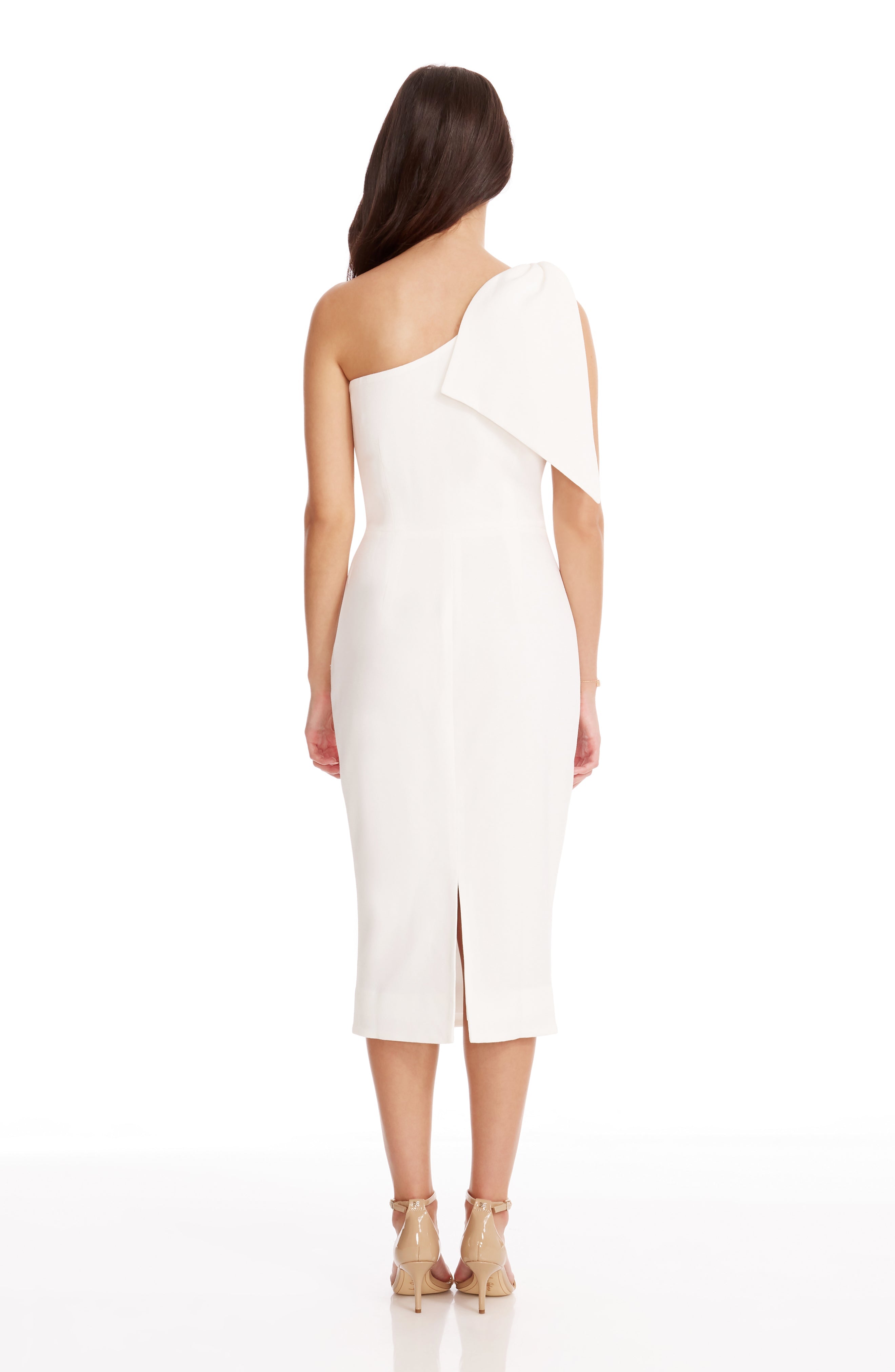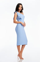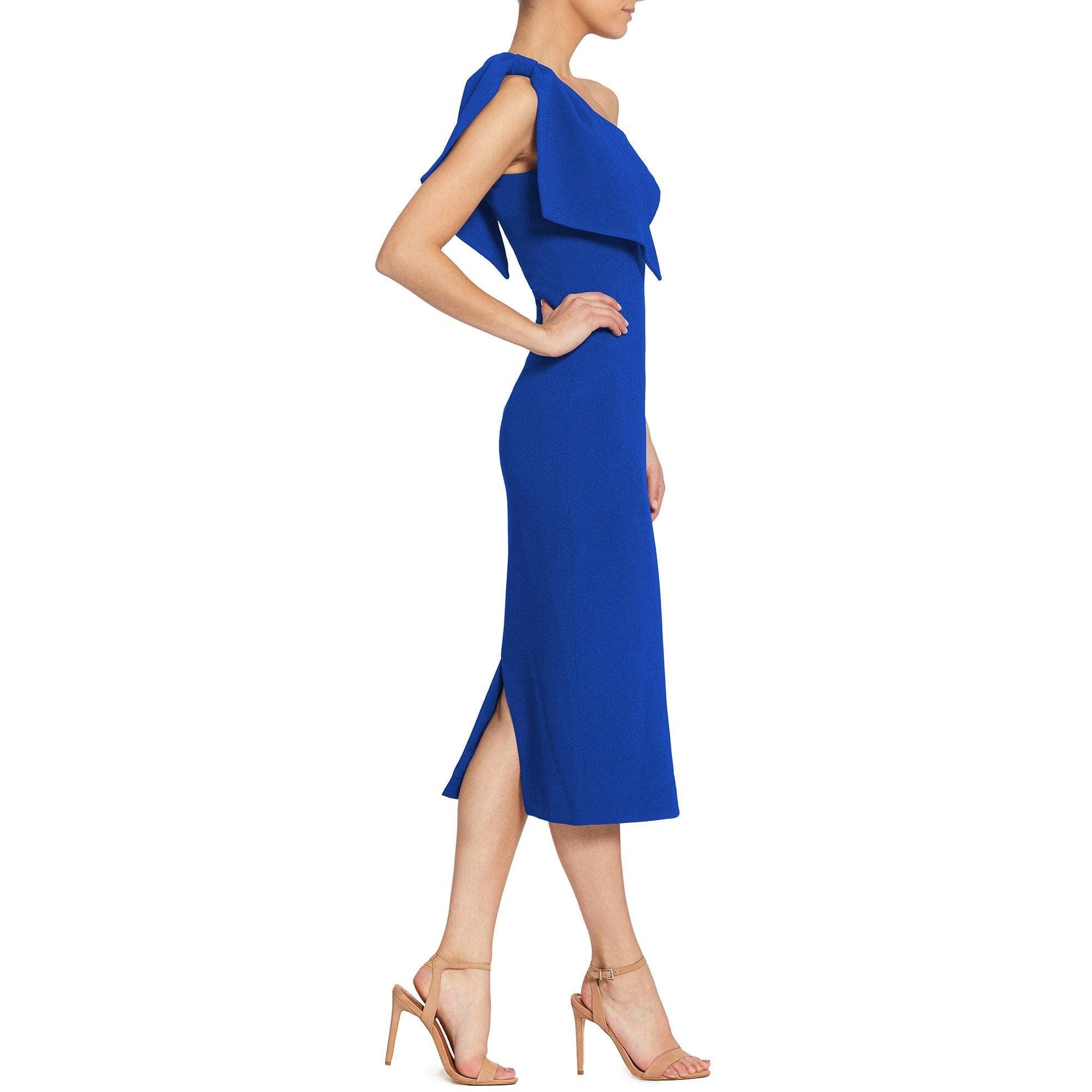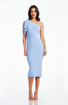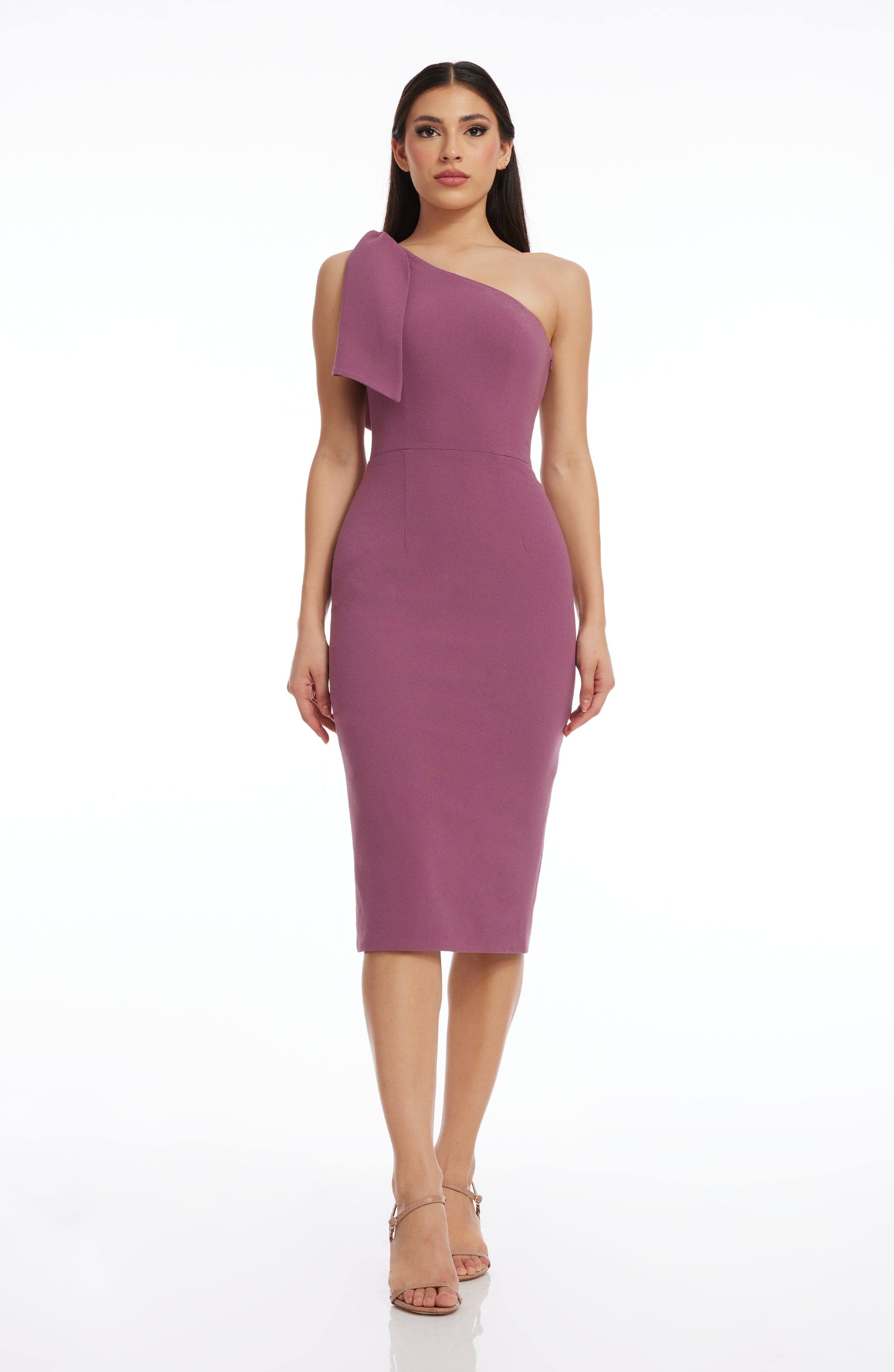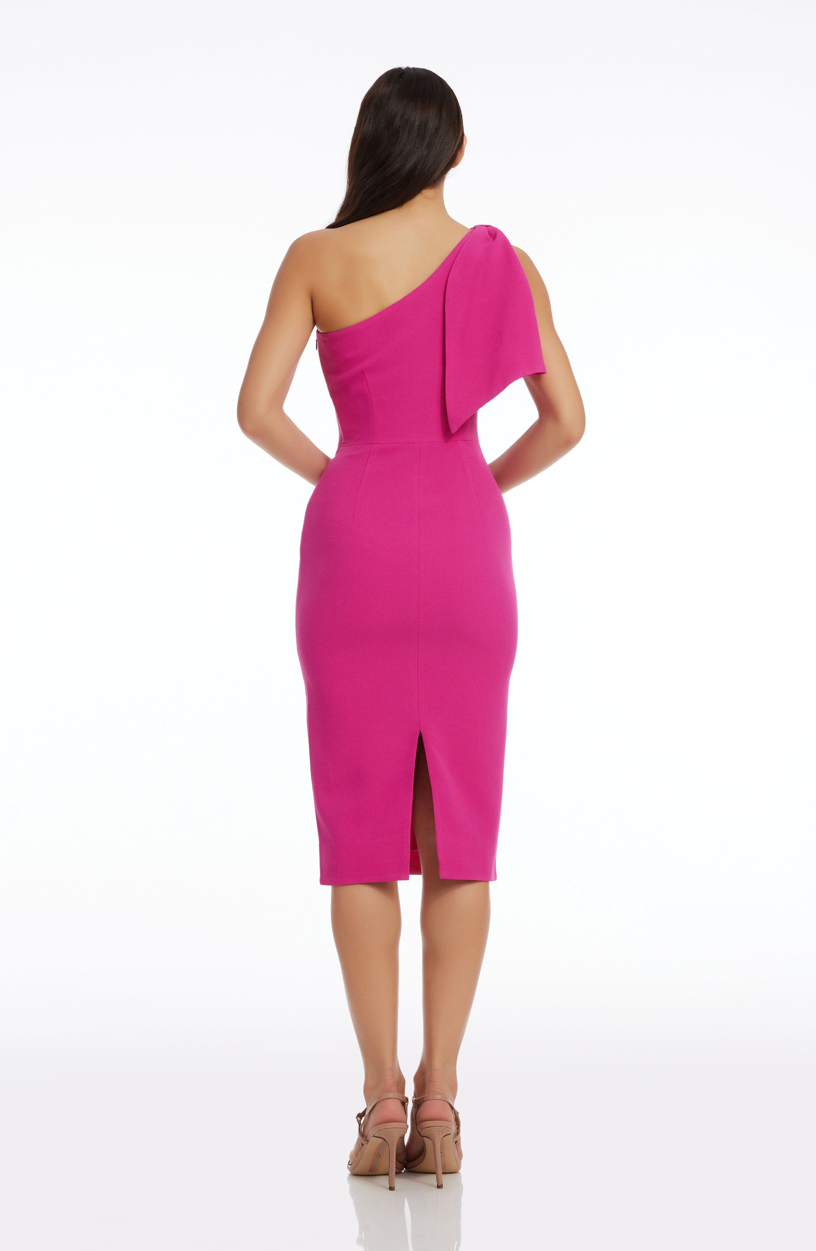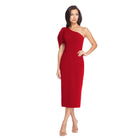 The Tiffany is an elegant asymmetrical dress made in our stretch crepe material. A large bow drapes over the single shoulder strap. The form-fitting silhouette has a straight, midi-length skirt that tapers in at the waist completed with a back slit.
