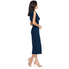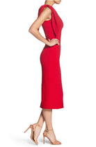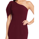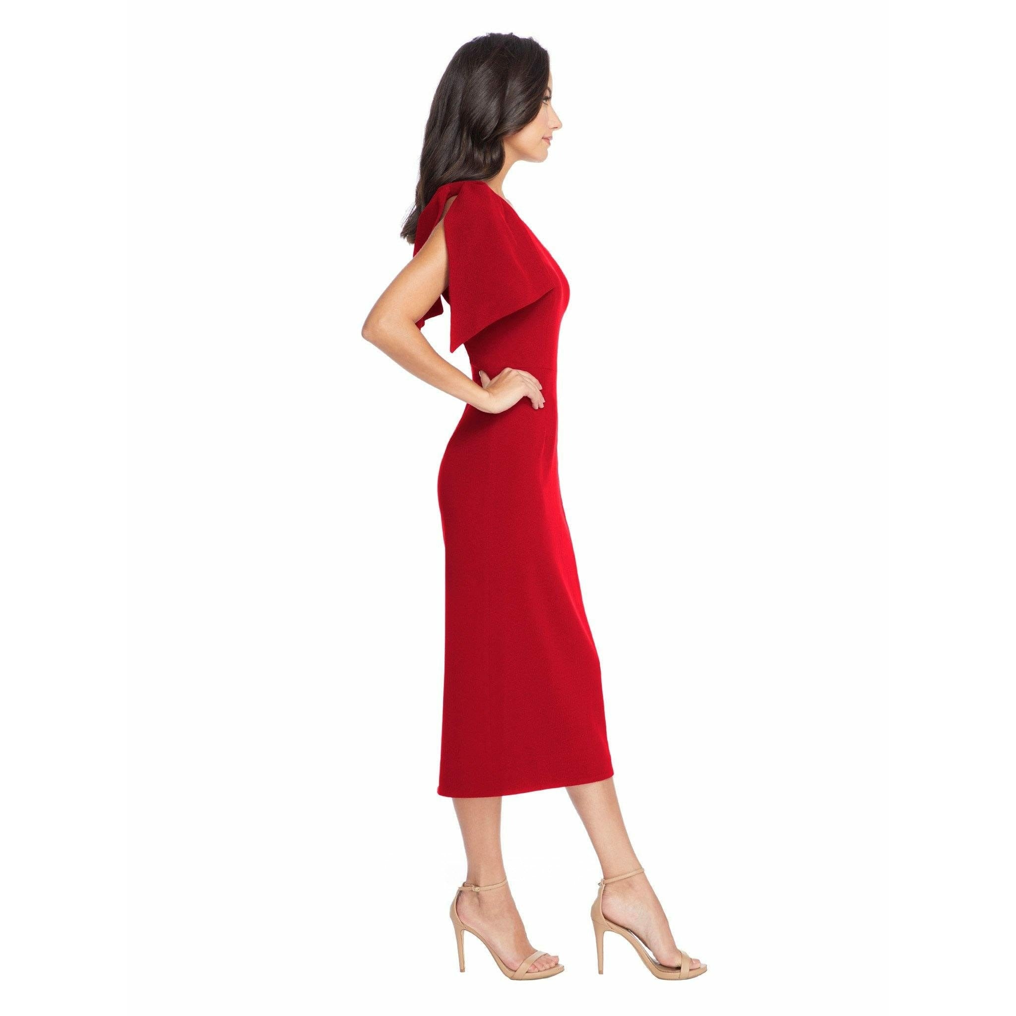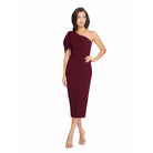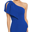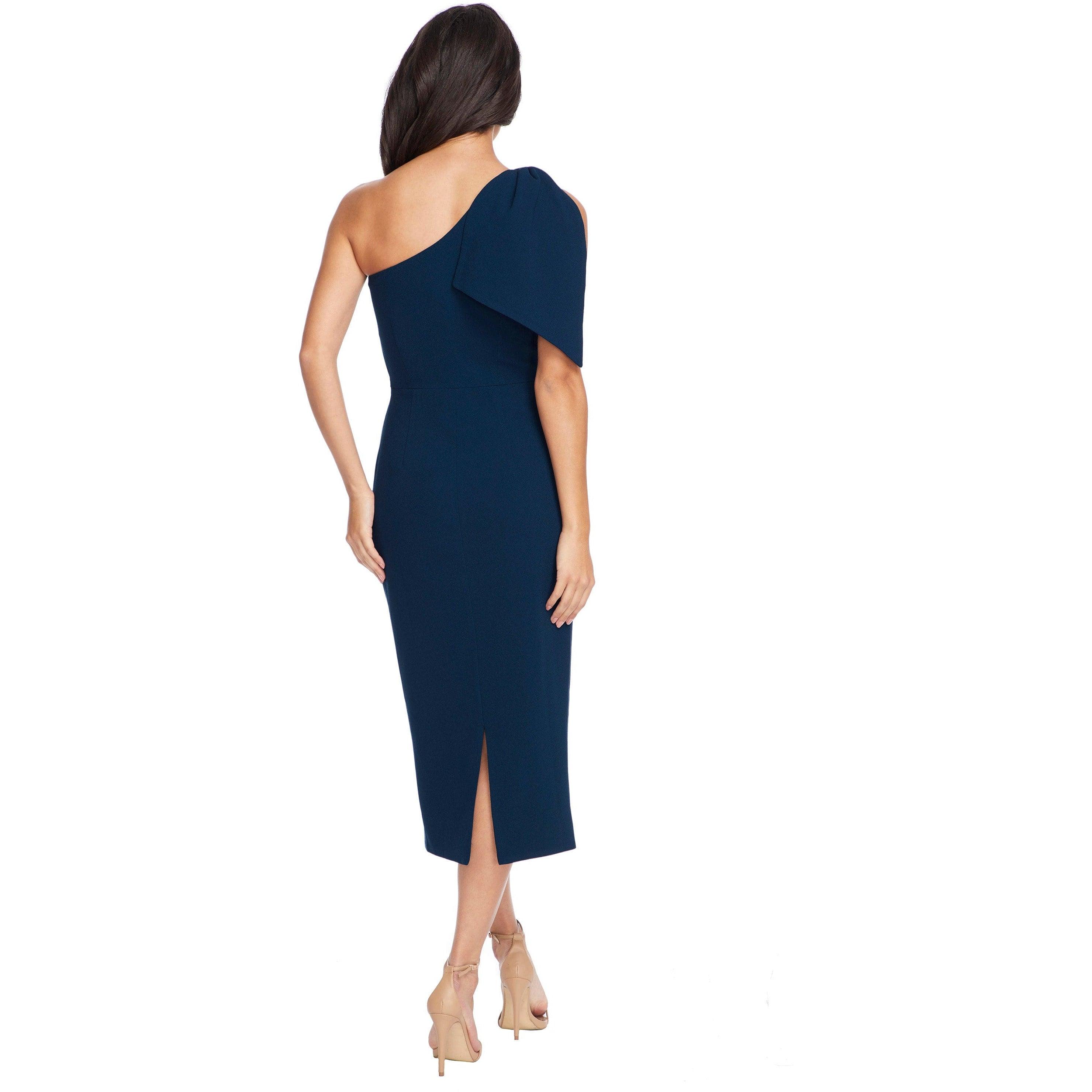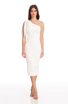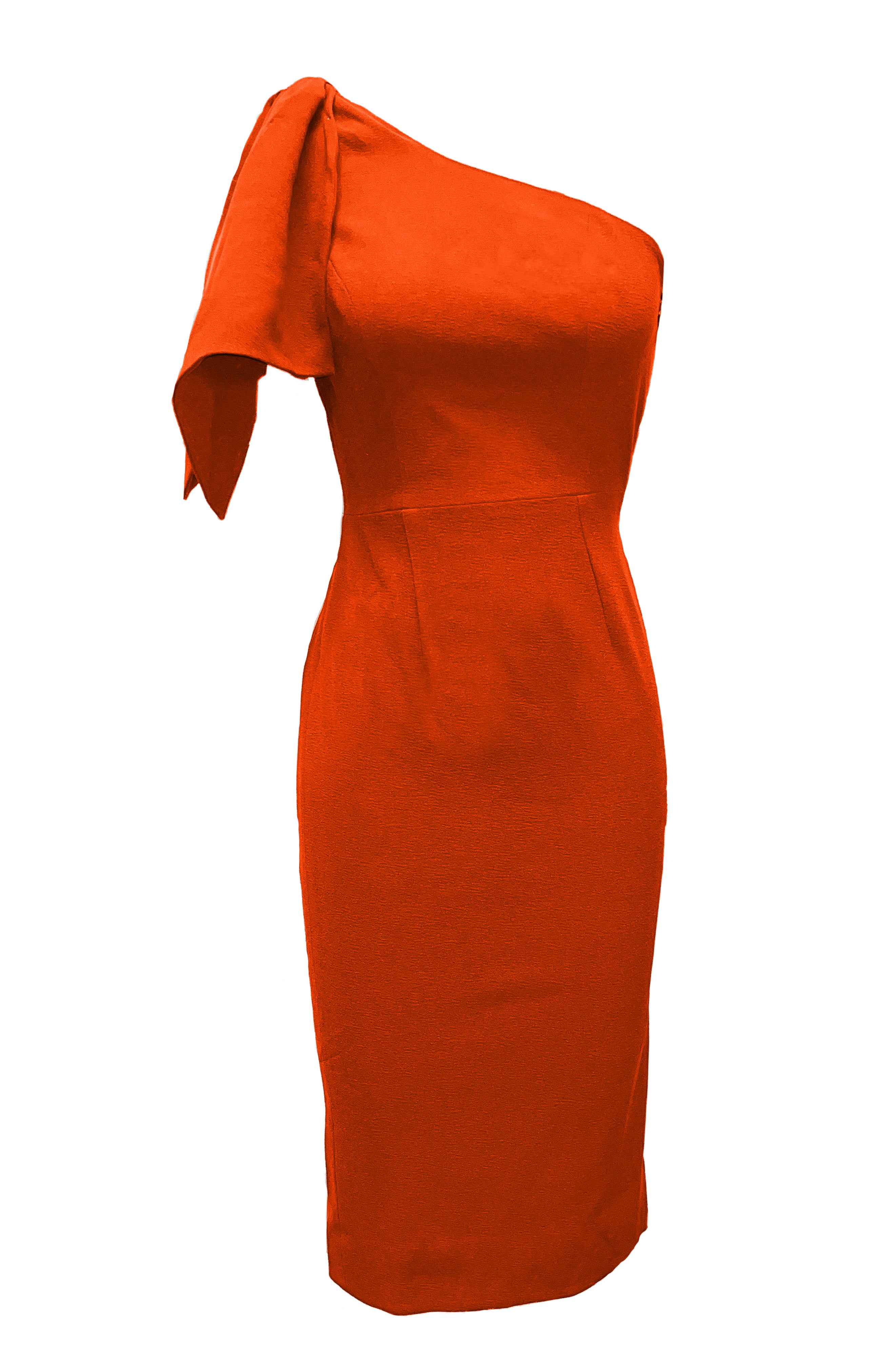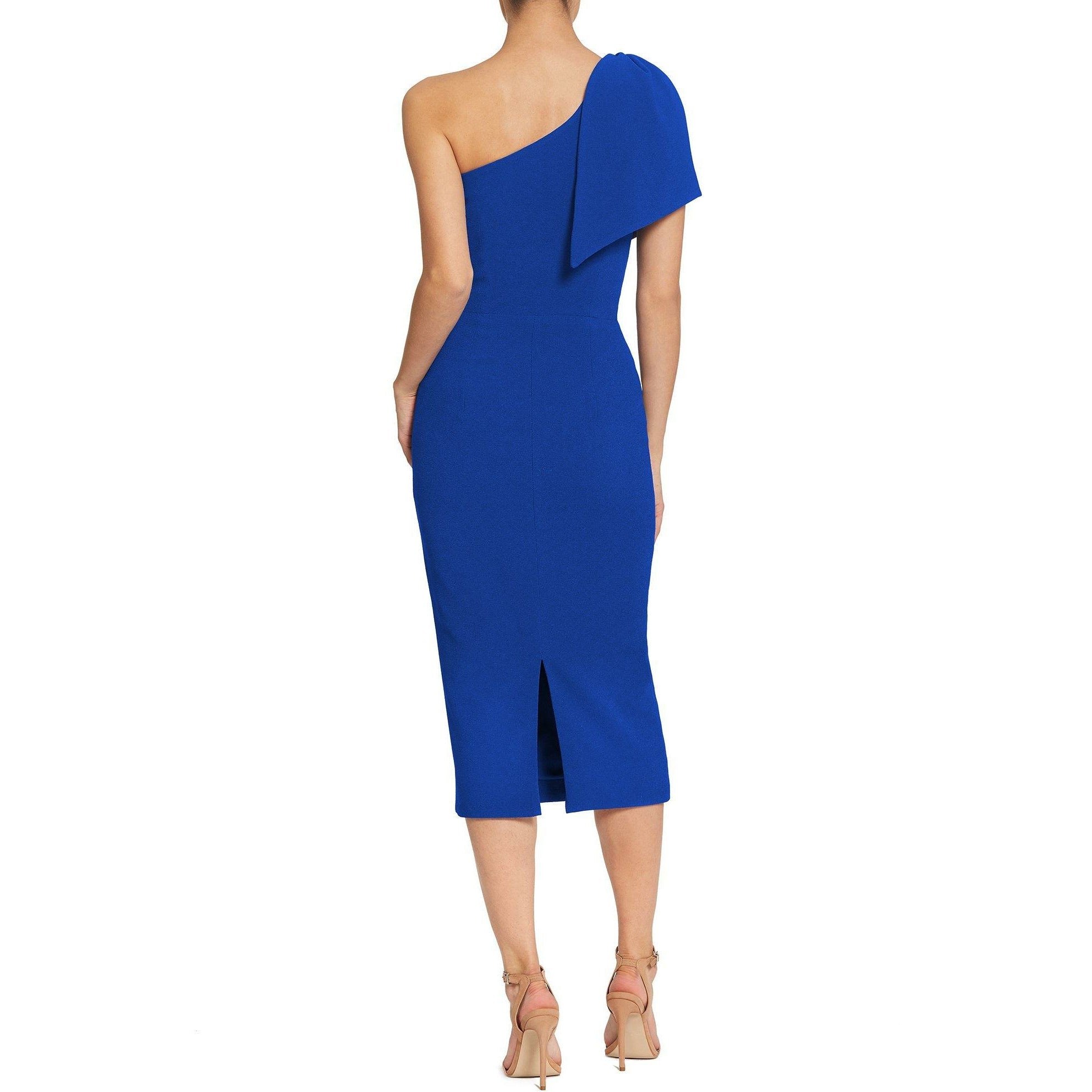 The Tiffany is an elegant asymmetrical dress made in our stretch crepe material. A large bow drapes over the single shoulder strap. The form-fitting silhouette has a straight, midi-length skirt that tapers in at the waist completed with a back slit.