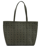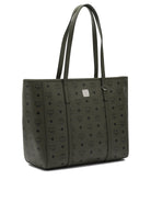 Mcm "Toni" tote shoulder bag, constructed of Visetos canvas with semi-rigid structure and defined profiles. The top handles are made of leather and secured with visible stitching. The wide silhouette is complemented by a top zipper closure and interior functional details. Silver cobalt metal elements and a brass logo plaque characterize the finish.