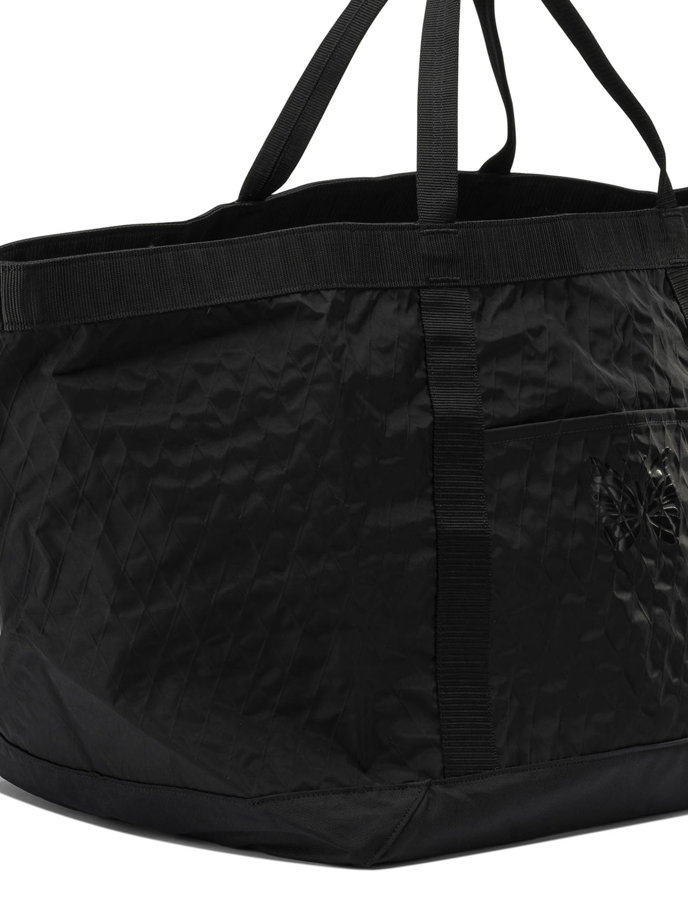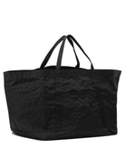 Needles "Tool Tote" travel bag, constructed of shiny nylon, features wide and soft structure, maintained by two reinforced handles and double top closure with adjustable straps. The silhouette generates volume and facilitates carrying, while the exterior layout includes two patch pockets, one of which is zippered. The surface is defined by the Needles logo printed on the front.