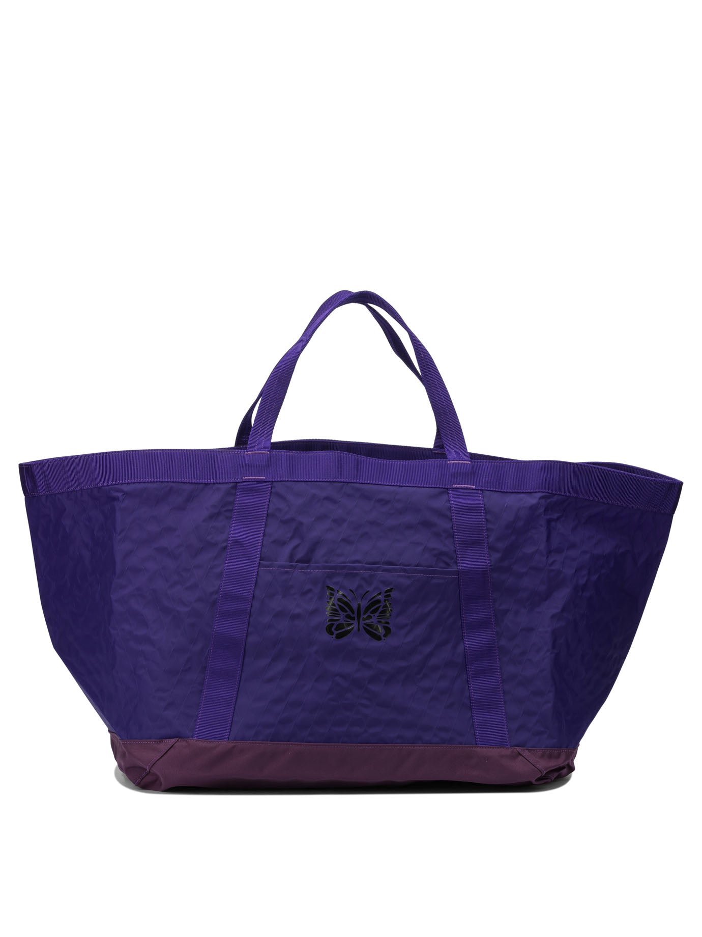 NEEDLES "TOOL TOTE" TRAVEL BAG, CONSTRUCTED OF SHINY NYLON, FEATURES WIDE AND SOFT STRUCTURE, MAINTAINED BY TWO REINFORCED HANDLES AND DOUBLE TOP CLOSURE WITH ADJUSTABLE STRAPS. THE SILHOUETTE GENERATES VOLUME AND FACILITATES CARRYING, WHILE THE EXTERIOR LAYOUT INCLUDES TWO PATCH POCKETS, ONE OF WHICH IS ZIPPERED. THE SURFACE IS DEFINED BY THE NEEDLES LOGO PRINTED ON THE FRONT.