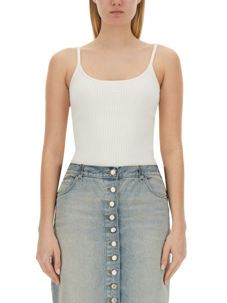 Elevate your everyday essentials with this sleek ribbed knit tank top from COURRÈGES. Crafted from a luxurious viscose-polyester blend, this slim-fit piece features delicate spaghetti straps and a flattering scoop neckline that effortlessly complements any silhouette.