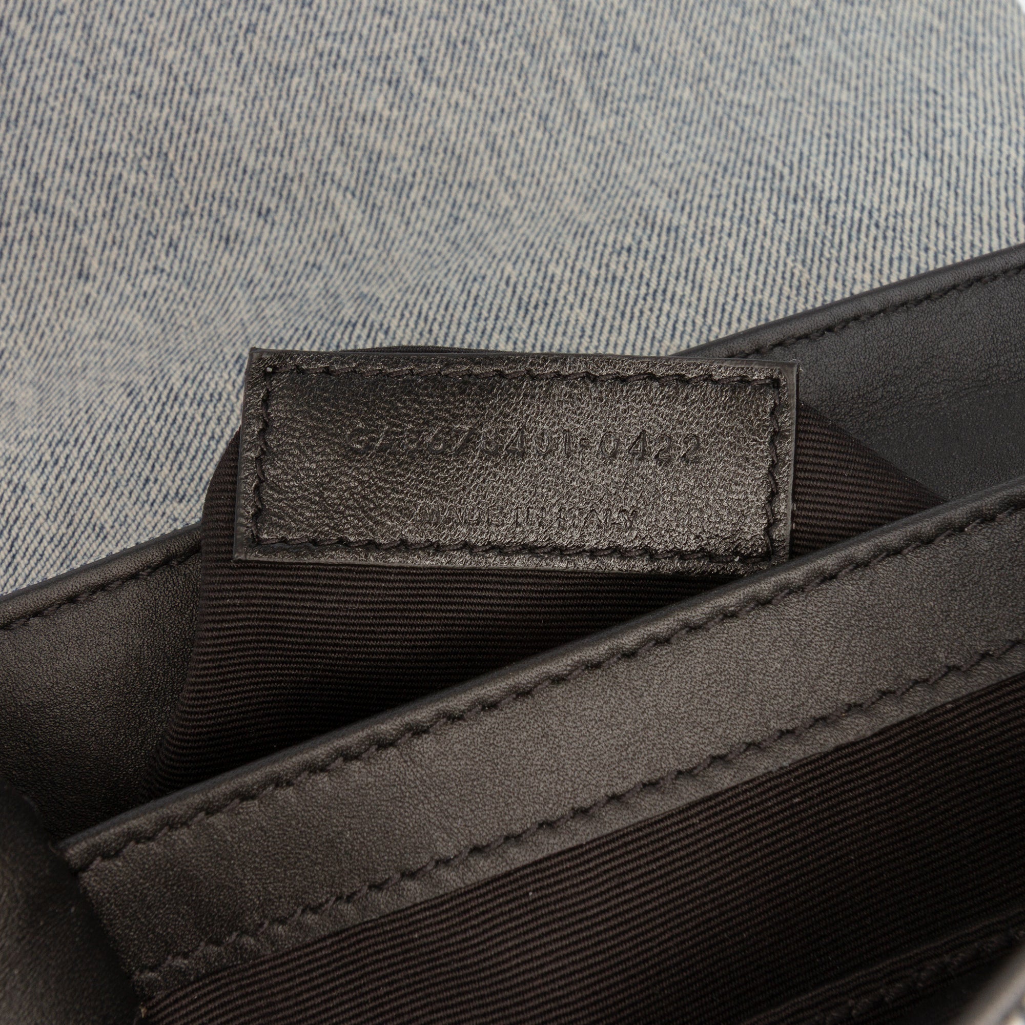 The Loulou features a denim body, a detachable flat leather shoulder strap, a front flap with magnetic snap closure, and interior zip and slip pockets.