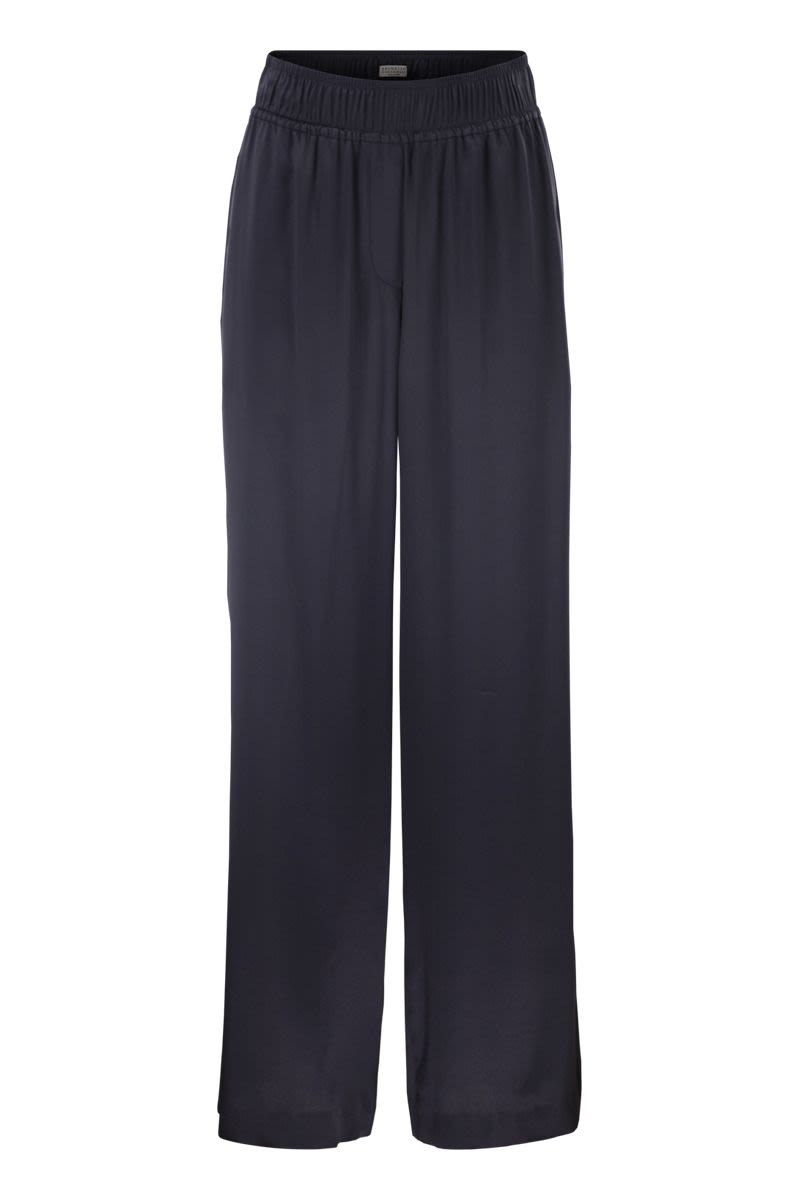 THE TRACK TROUSERS IN STRETCH SILK SATIN COMBINE FEMININE ELEGANCE WITH RELAXED VOLUMES. THE CHARACTERISTIC FLUID AND IRIDESCENT TEXTURE OF THE FABRIC ACCOMPANIES THE SOFT LINES OF THE GARMENT, MAKING IT PARTICULARLY COMFORTABLE TO WEAR. THE PULL-UP FIT COMPLETES THE COMFORT AND GIVES THE MODEL A CASUAL NOTE. AN ELEGANT FABRIC WITH A SHINY EFFECT AND A FLOWING HAND, STRETCH SILK SATIN IS A CLASSIC AMONG BRUNELLO CUCINELLI'S FINE MATERIALS. A SMALL PERCENTAGE OF SYNTHETIC FIBRE ENHANCES WEARING COMFORT. - PULL-UP TROUSERS - FRONT POCKETS DESIGNER ID: M0C59P8942 C8901