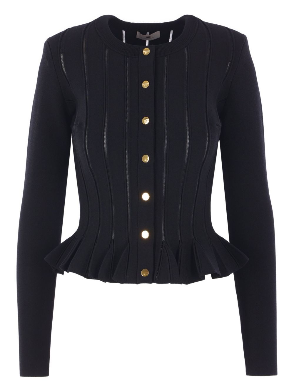 BLACK RIBBED KNIT PEPLUM HEM GOLD BUTTONS VERTICAL SEAMS LONG SLEEVES