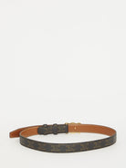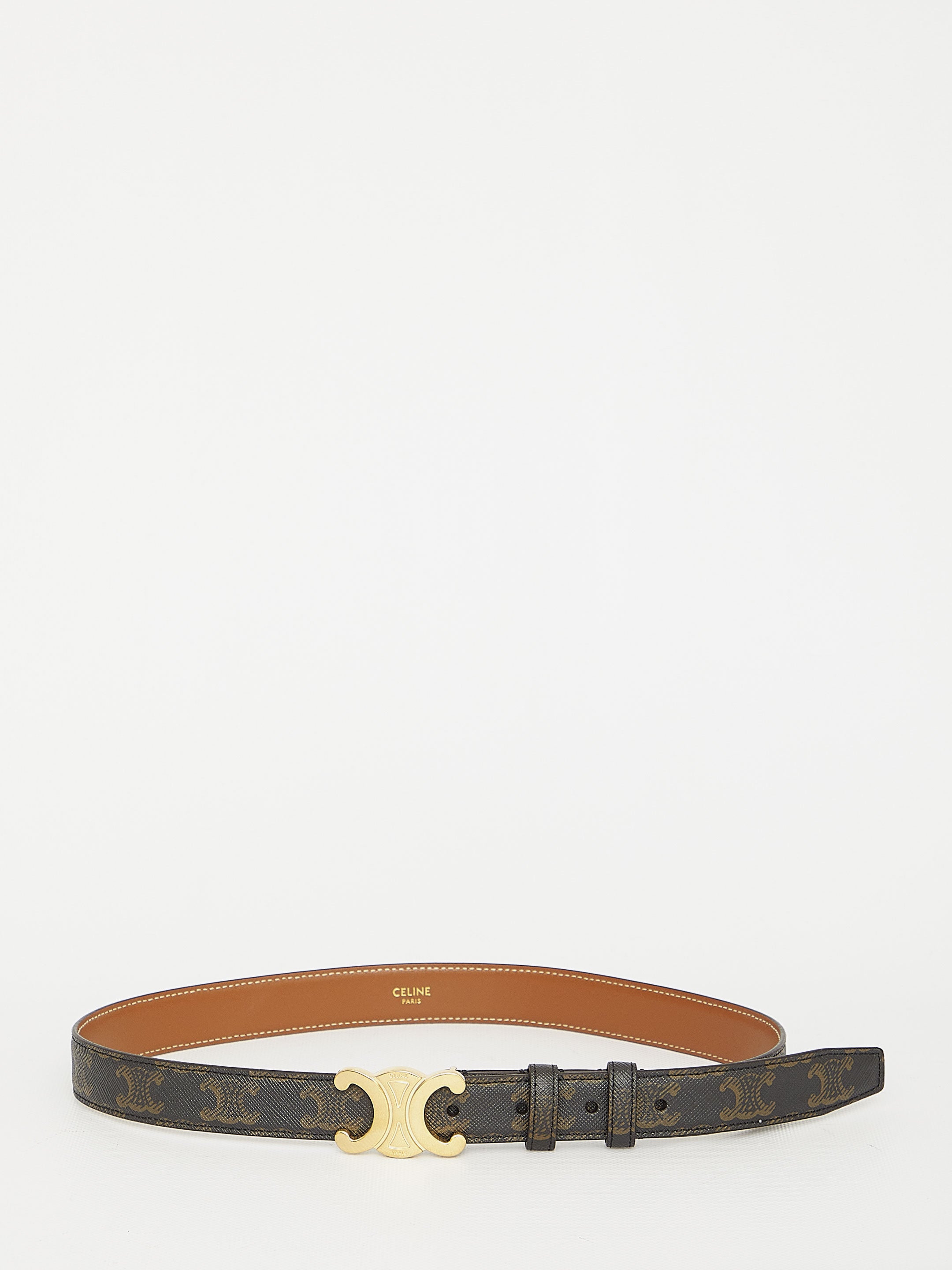 Brown Triomphe canvas belt with gold-tone metal Triomphe buckle. Adjustable design.