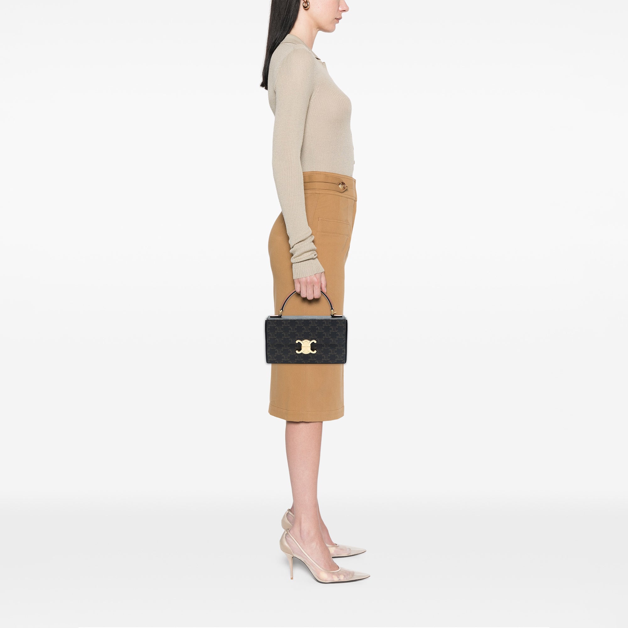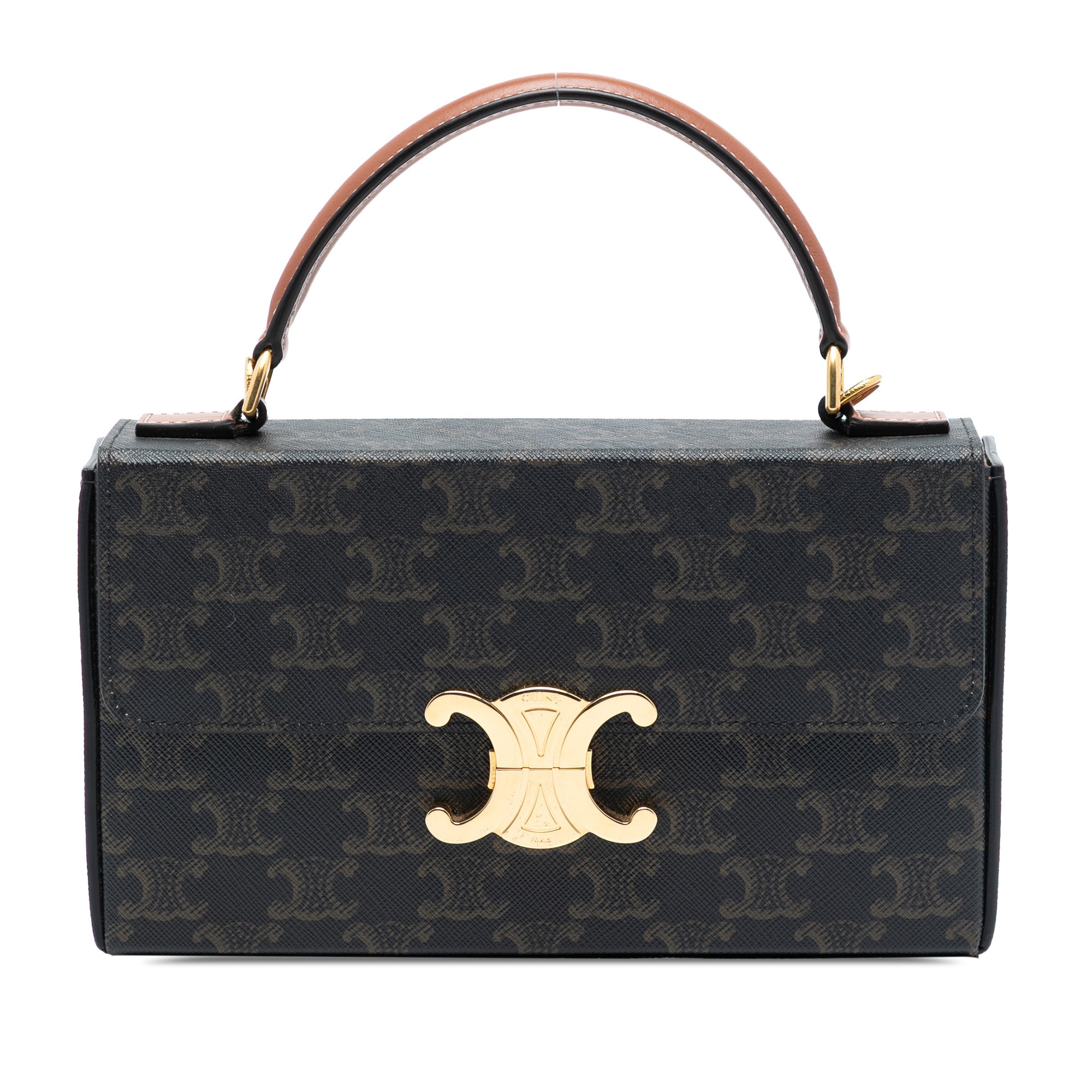 Elevate your everyday style with this iconic Celine Triomphe Coated Canvas Box Top Handle Bag. This sophisticated satchel showcases the house's signature Triomphe monogram in coated canvas, complemented by luxurious leather accents.