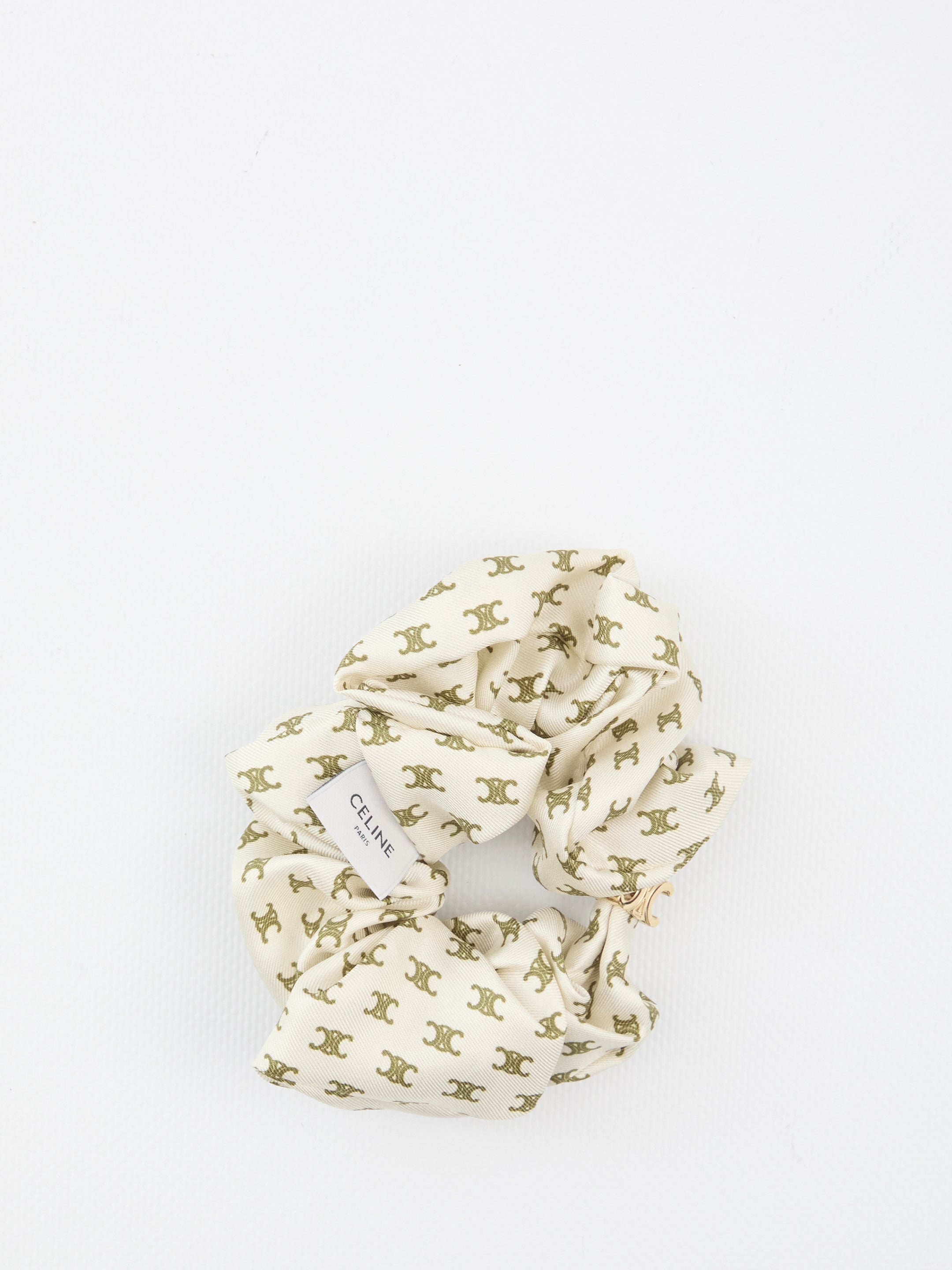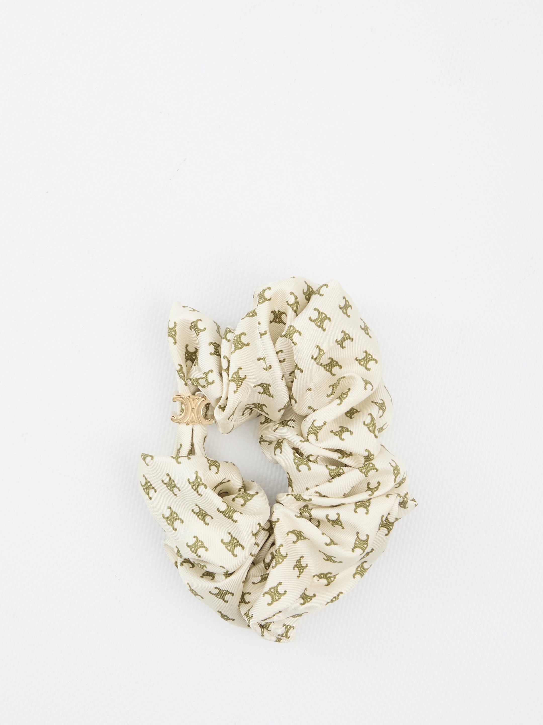 WHITE SILK SCRUNCHIE WITH ALLOVER KHAKI TRIOMPHE LOGO. FEATURES A BRASS TRIOMPHE DETAIL.