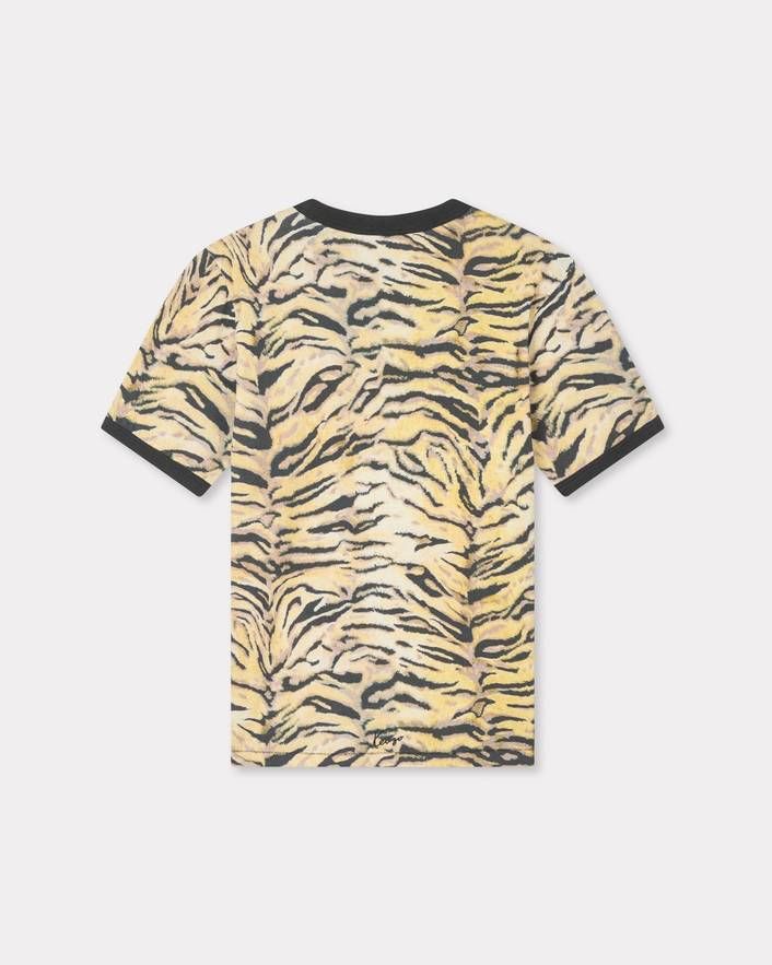 Make a bold statement with this distinctive t-shirt from Kenzo, featuring their iconic tiger stripe print in warm tan and black tones. The classic crew neck silhouette is elevated with contrasting ribbed trim at the neckline and sleeves, adding a refined touch to this casual essential.