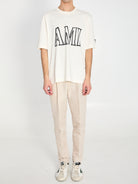 T-SHIRT IN HEAVY CREAM WHITE COTTON JERSEY. IT FEATURES A RIBBED CREWNECK, LONG SLEEVES, AN AMI PARIS PRINT ON THE FRONT AND BACK, AN AMI DE COEUR PRINT ON THE SLEEVE, AND A BOXY CUT. OVERSIZED FIT.