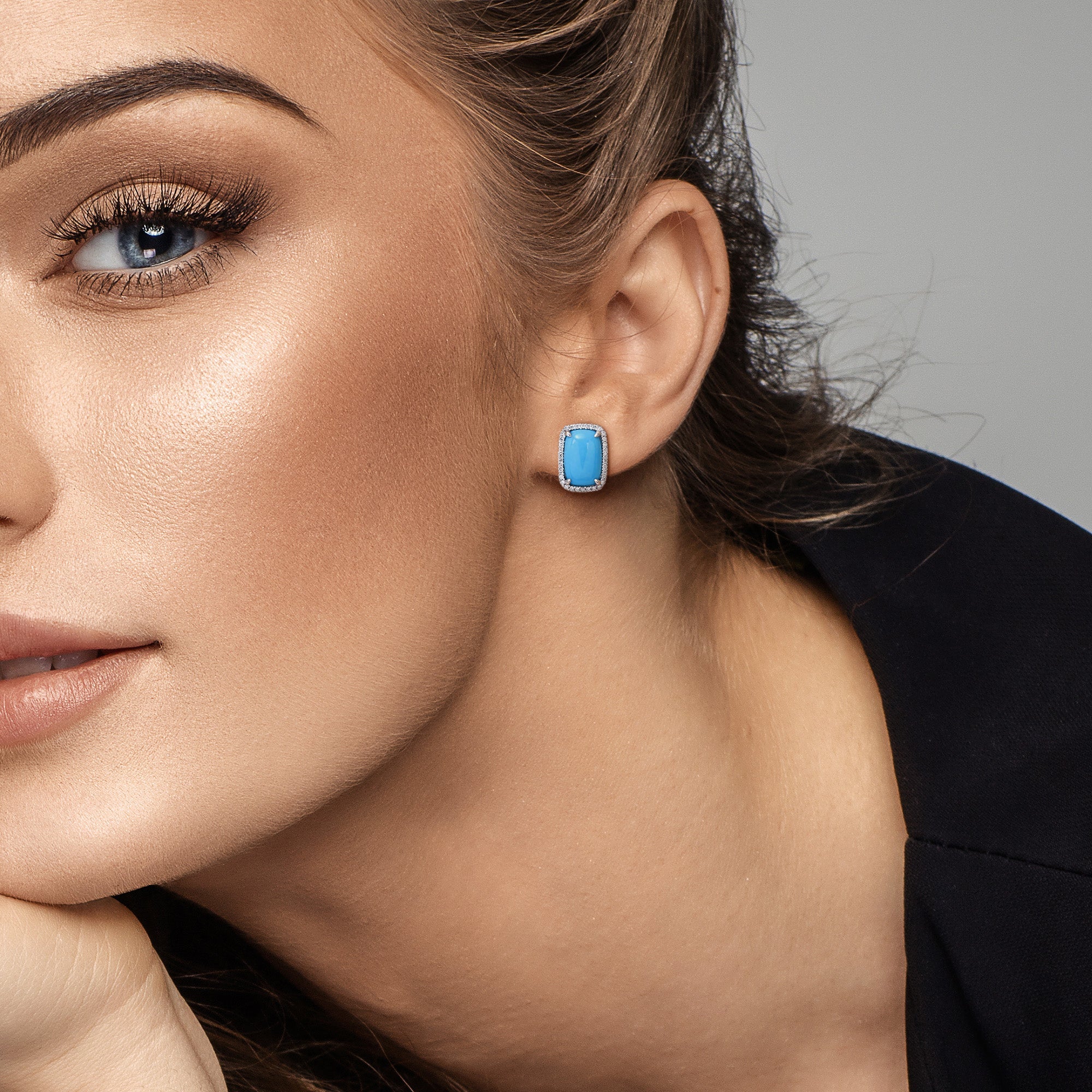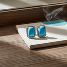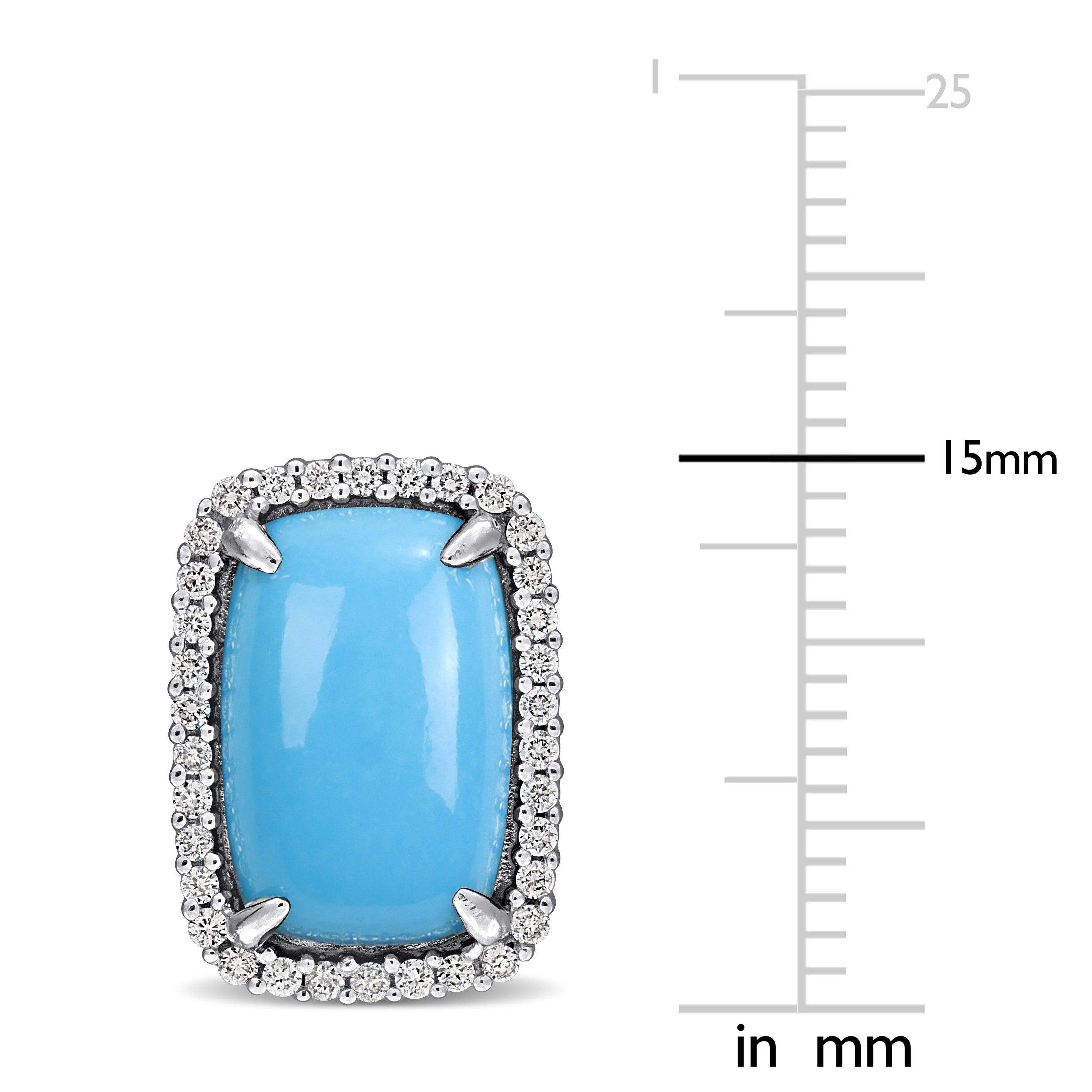 Make a bold yet sophisticated statement with these stunning turquoise and diamond halo earrings. Set in luminous 14K white gold, each earring features a captivating 2 cushion-shaped turquoise center stone, prized for its vivid robin's egg blue hue and smooth, polished surface. Surrounding the turquoise is a sparkling halo of 68 round brilliant diamonds, expertly crafted to enhance the gemstone’s vibrant beauty while adding a touch of radiant luxury.