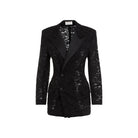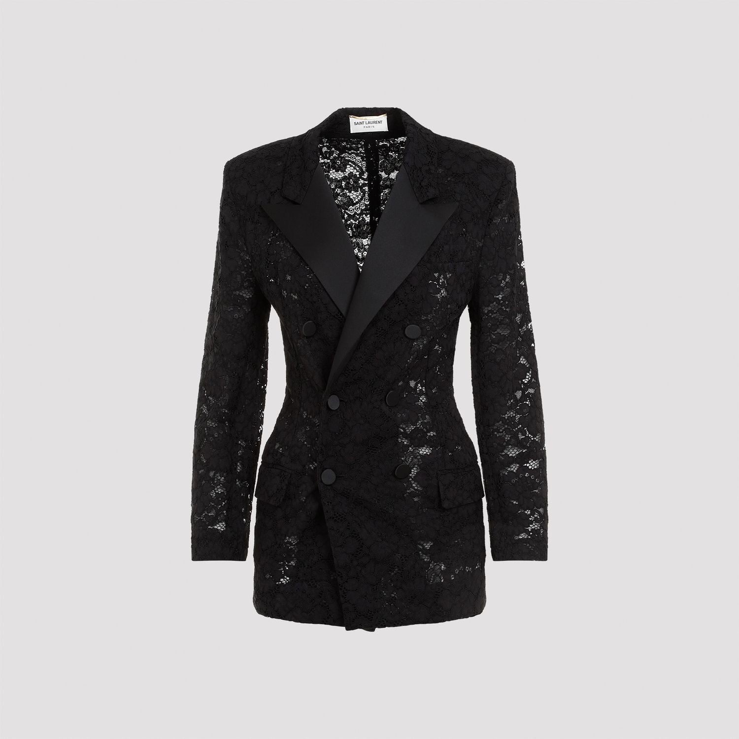 SEMI-SHEER TUXEDO JACKET IN BLACK GUIPURE. IT FEATURES PADDED SHOULDERS, SATIN PEAKED LAPELS, DOUBLE-BREASTED BUTTON CLOSURE, A WELT POCKET ON CHEST, TWO FRONT FLAP POCKETS AND BUTTONED CUFFS. FITTED STYLE.