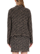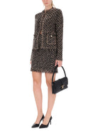 The tailored silhouette is enhanced by decorative button-detailed pockets and elegant fringe trim along the hem, making it perfect for both professional settings and evening occasions. Style it with the matching skirt for a coordinated ensemble, or pair it with tailored trousers and heels for a polished office look.