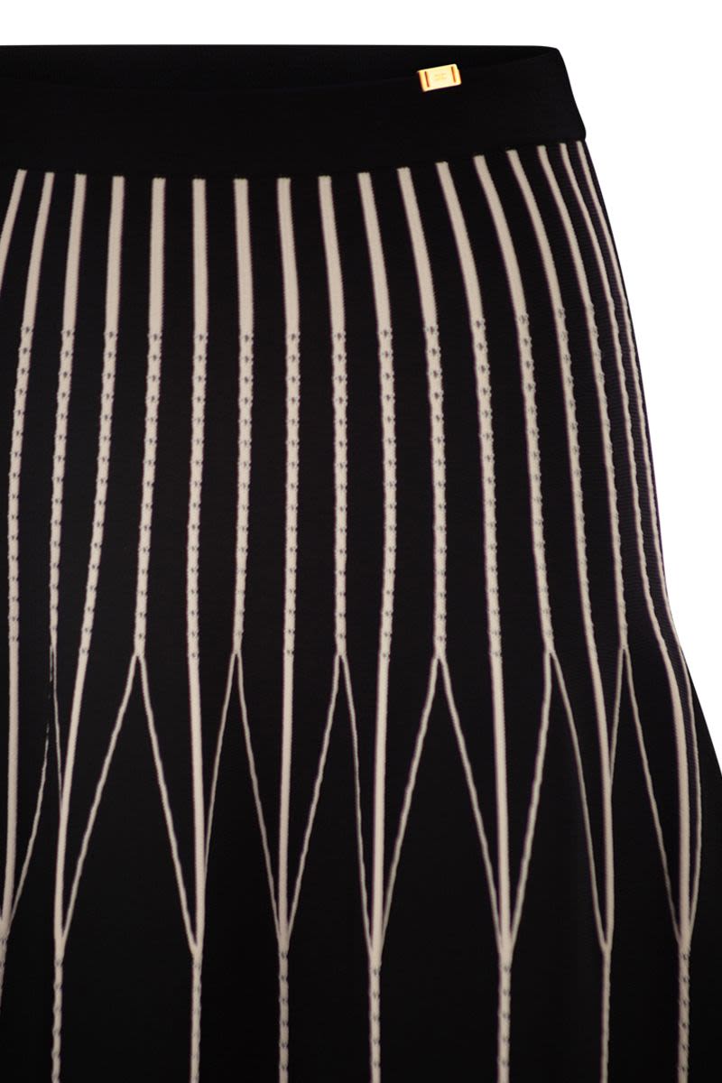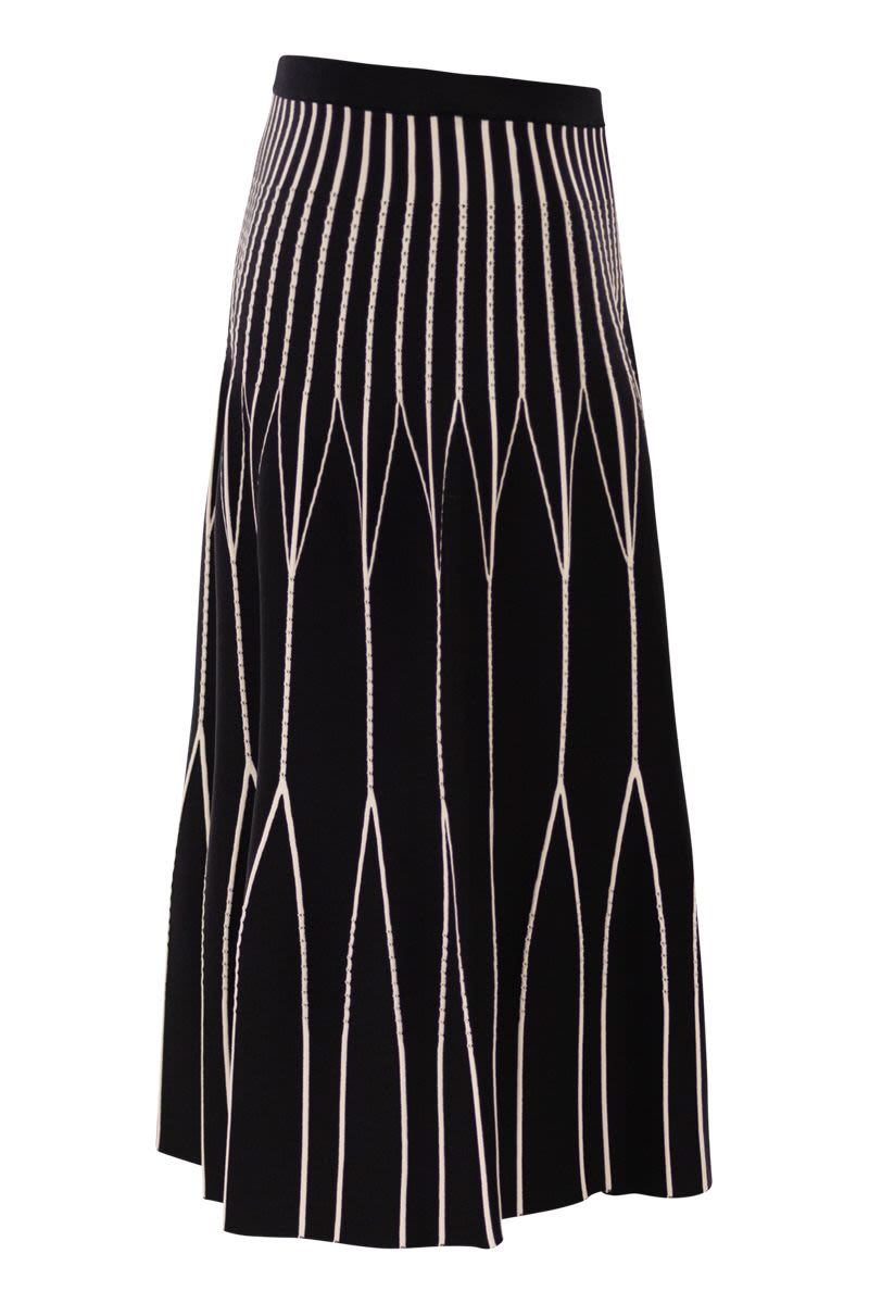 KNITTED SKIRT. IT STANDS OUT FOR ITS POINT FABRIC TEXTURE THAT OPENS UP IN A PLEATED MOVEMENT. THE PUNCHED HOLES AND TWO-TONE WEAVE ENHANCE THE GEOMETRIC DESIGNS OF THE GARMENT, CREATING A BOLD AND HARMONIOUS GRAPHIC CONTRAST. THE WAISTBAND IS EMBELLISHED WITH A LOGO DETAIL. - REGULAR FIT - GOLD METAL DETAIL WITH LOGO - CONCEALED ZIP ON THE SIDE DESIGNER ID: GK31S62E2 685