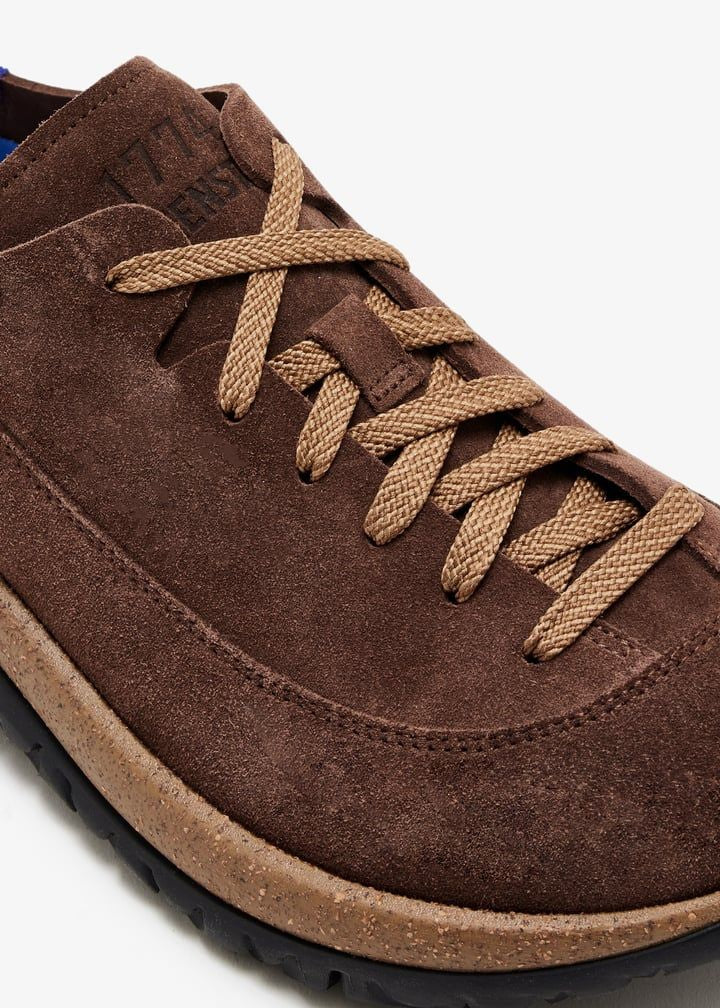 The chunky, textured sole provides excellent support and a modern edge, while the slip-on construction makes them perfect for easy, everyday wear. The rich brown suede upper is complemented by contrasting sole details and a subtle blue accent at the heel.