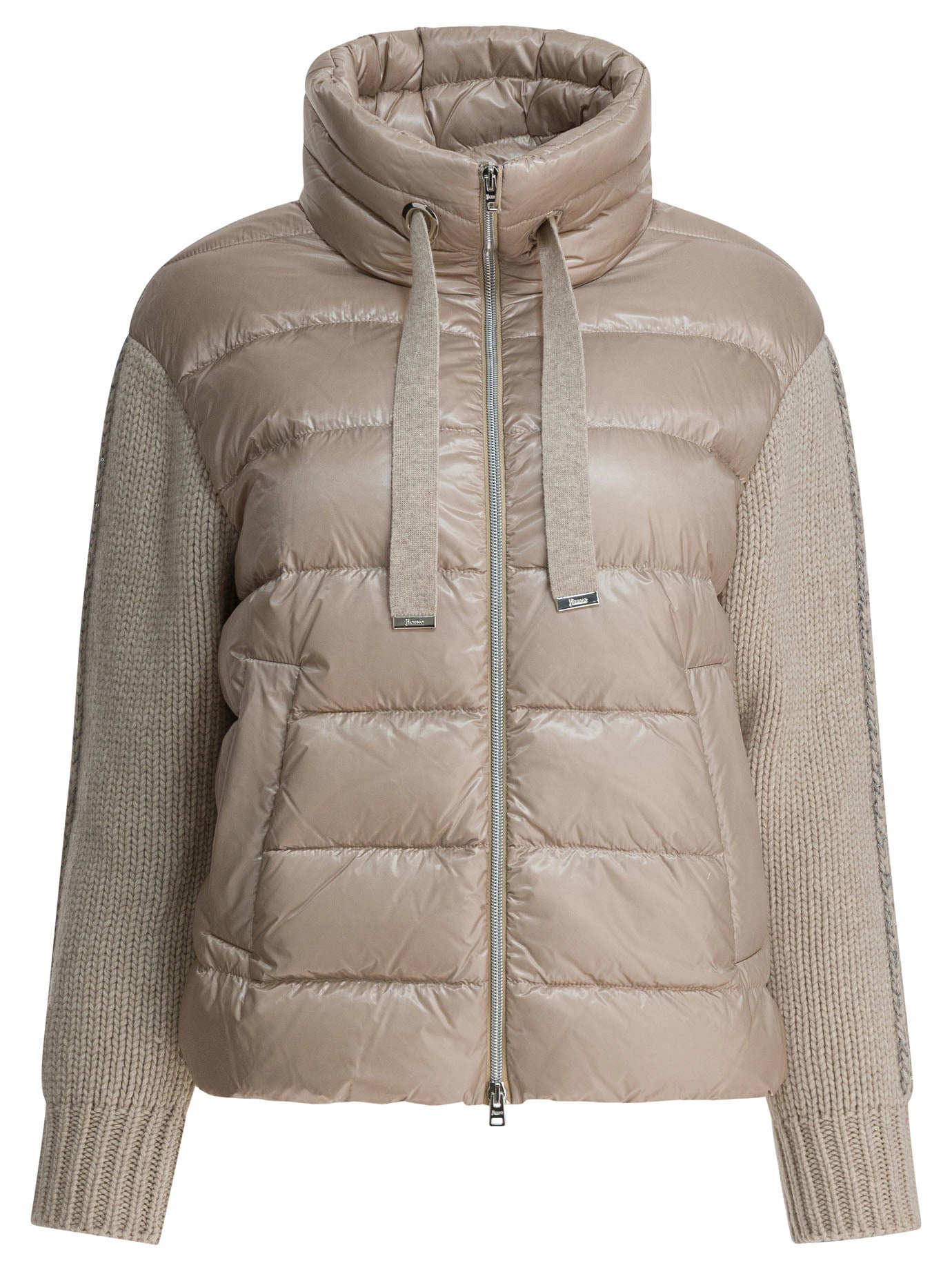 "Resort" down jacket in Ultralight Nylon and Herno knit constructed with down filling, striped quilted structure, main body in tightly woven technical nylon with smooth hand effect, and sleeves in fine gauge 3 ribbed wool knit. Shaped high collar with adjustable drawstring. Front closure with double-slider zipper. Integrated welt side pockets. Metal Herno logo applied on the back.