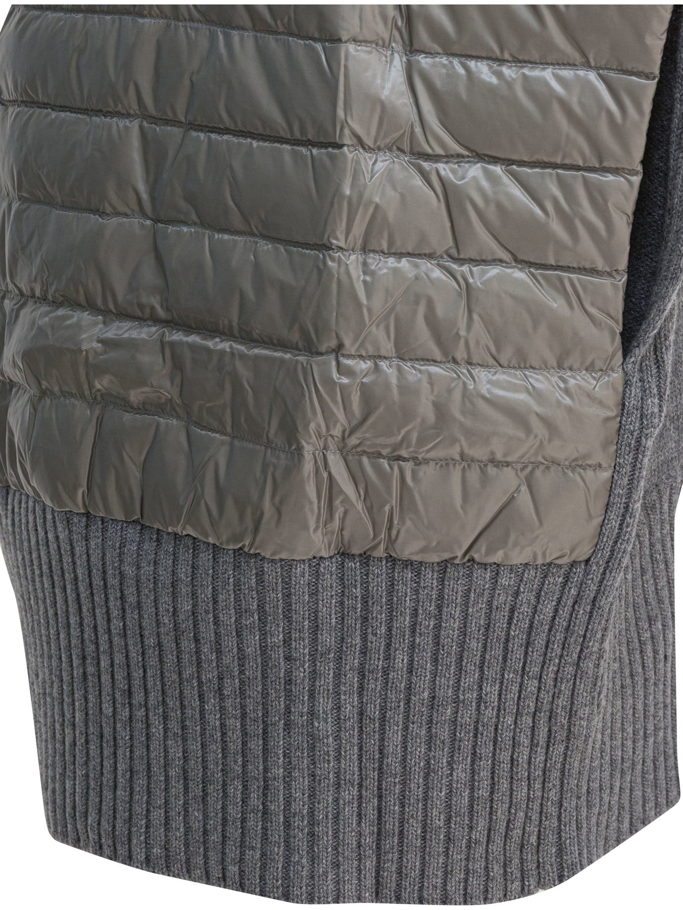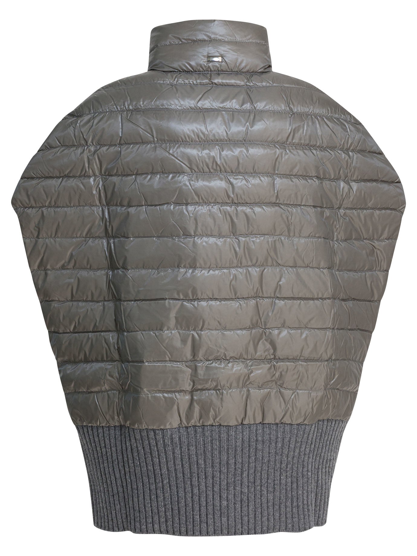 Wool and Nylon Ultralight Herno cape features a ribbed knit construction and technical fabric details. The wide silhouette defines a structure with straight lines, with wing sleeves and front closure via a double-slider zipper. The high collar is finished with striped quilting, the inner padding is down and the edges are ribbed. Side welt pockets integrated into the construction.