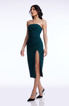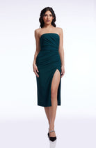 The Valencia Dress features a flattering strapless design and ruched body for a stylish and sophisticated look. Made with high-quality materials, this midi dress is perfect for any occasion. Elevate your wardrobe and feel confident and elegant in the Valencia Dress.