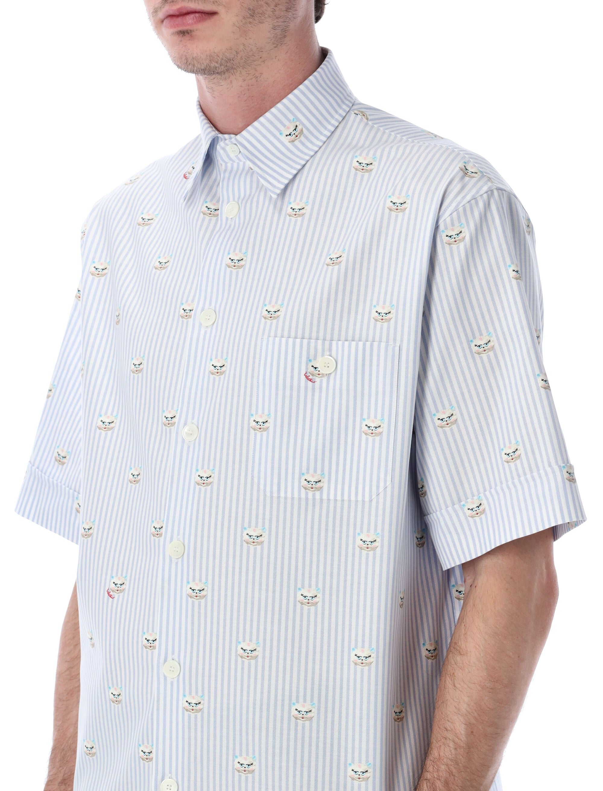 VALENTINO SHIRT CRAFTED FROM FINE OXFORD COTTON, FEATURING THE ICONIC LE CHAT DE LA MAISON PRINT, A PLAYFUL AND REFINED EMBLEM OF THE BRAND. DESIGNED WITH SHORT SLEEVES AND A CLEAN SILHOUETTE, THIS PIECE OFFERS A MODERN YET TIMELESS APPEAL, SUITABLE FOR BOTH ELEVATED CASUAL LOOKS AND MORE POLISHED OUTFITS. CLASSIC TAILORING DETAILS HIGHLIGHT VALENTINO’S SIGNATURE ELEGANCE.