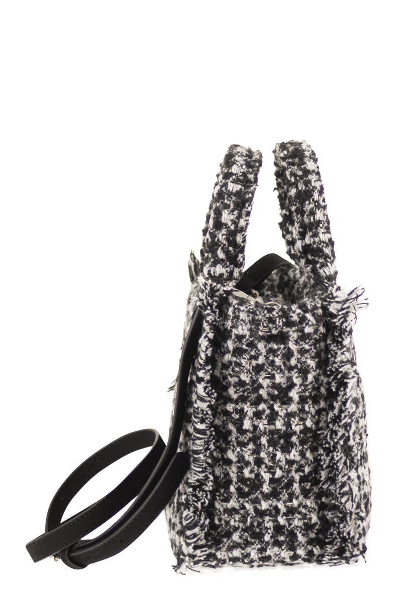THE FABRIC VANITY MINI IS DESIGNED FOR THOSE WHO LOVE BOLD, ORIGINAL LOOKS. FINISHED WITH A LOGO ON THE FRONT AND FRINGED EDGES. - HANDBAG - FABRIC HANDLES - REMOVABLE AND ADJUSTABLE SHOULDER STRAP - INTERNAL POCKET - EMBROIDERED LOGO, FRINGED DETAIL DESIGNER ID: VAMI026 01323I W 20 X H 19 X D 10 CM