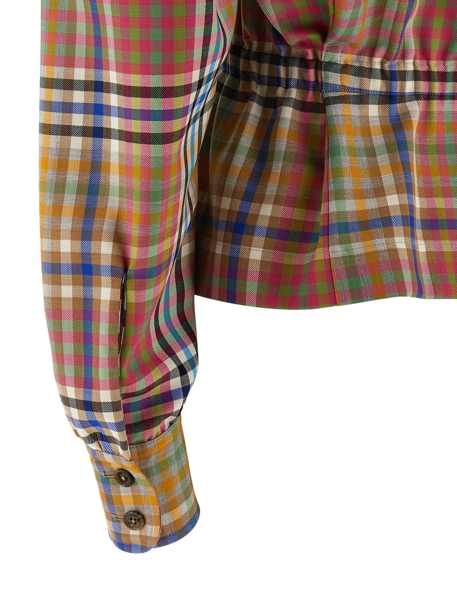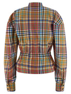 Crafted from lightweight Heather Check wool, this single-breasted blazer features the iconic Vivienne Westwood plaid in a vibrant multi-color palette. The high neck with button closure and distinctive front teardrop cut-out detail add an unexpected twist to traditional blazer styling, while the elastic waistband creates a flattering, cinched silhouette.
