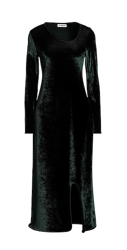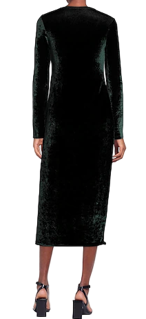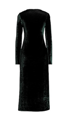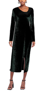 Luxurious velvet crafted into an effortlessly elegant silhouette, this midi dress features a refined crew neckline and flowing long sleeves. The unlined trapeze cut skims the body with graceful movement, while the solid color palette ensures timeless versatility. Perfect for elevated occasions or polished everyday wear, this piece combines understated sophistication with sumptuous texture.