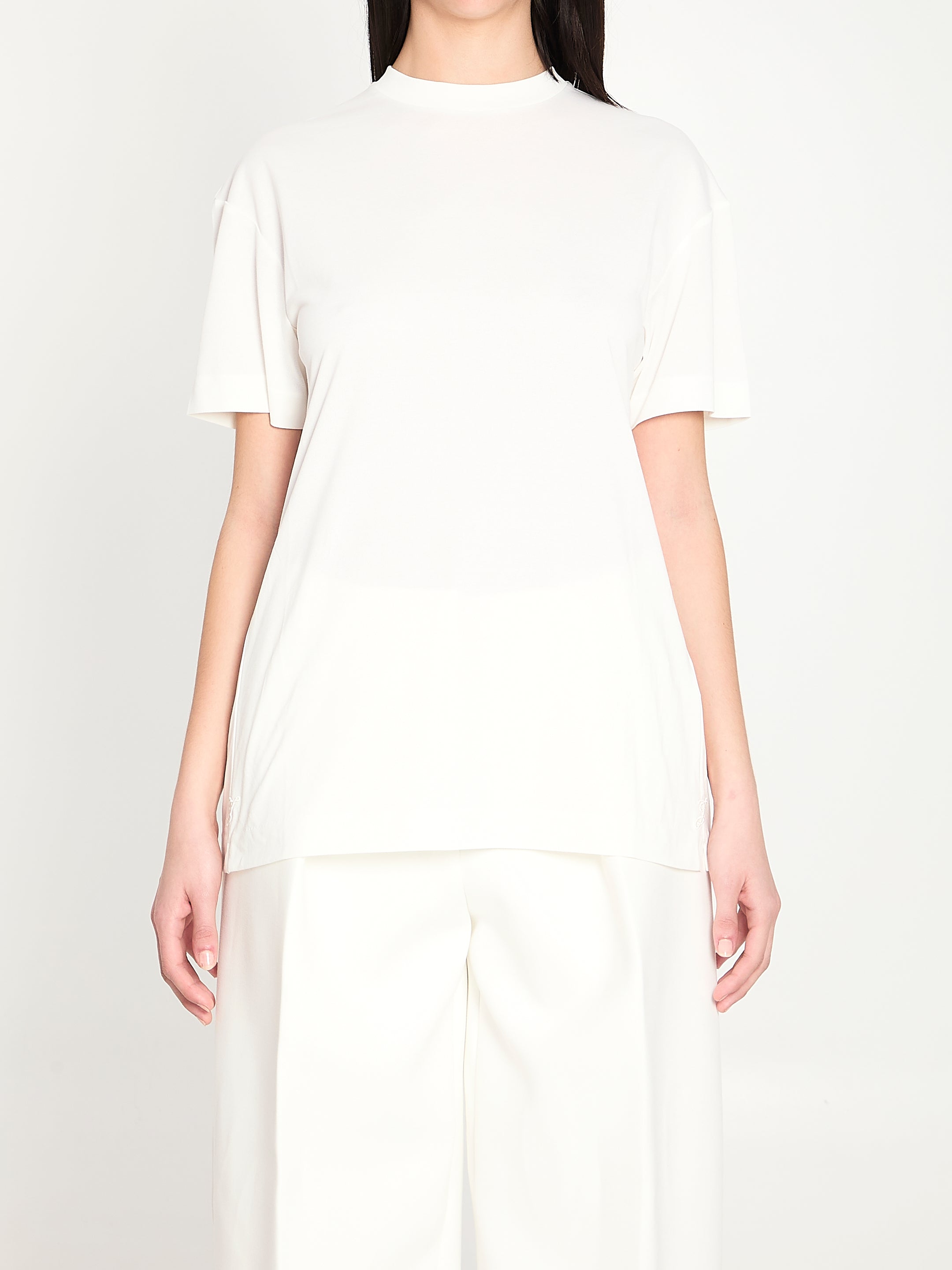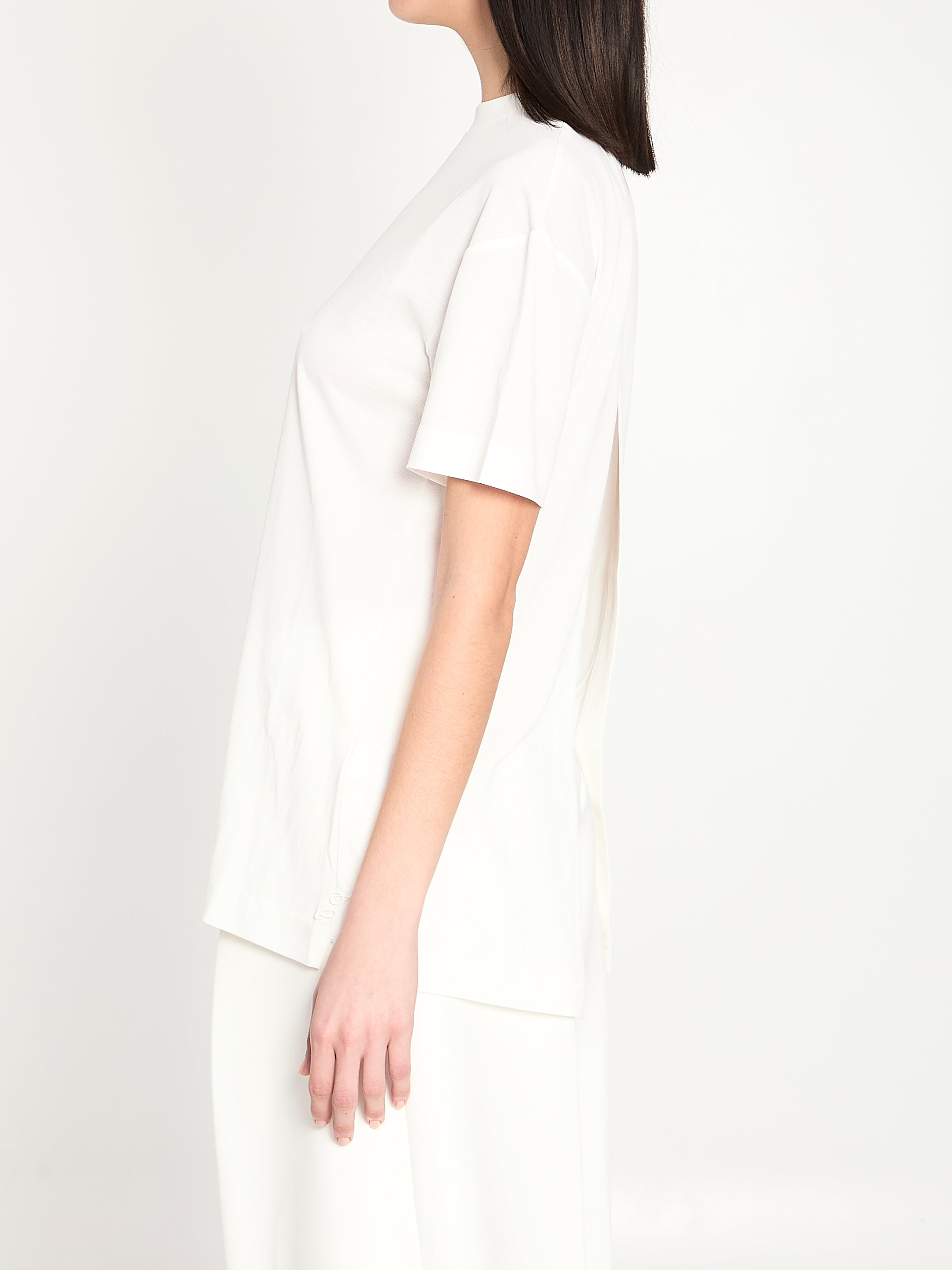 White paper-effect jersey t-shirt. Features a ribbed crewneck, short sleeves, side slits with an embroidered J on each side, three-button closure on the back, partially exposed back with draped panels on each side, straight cut. Regular fit.