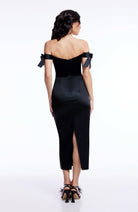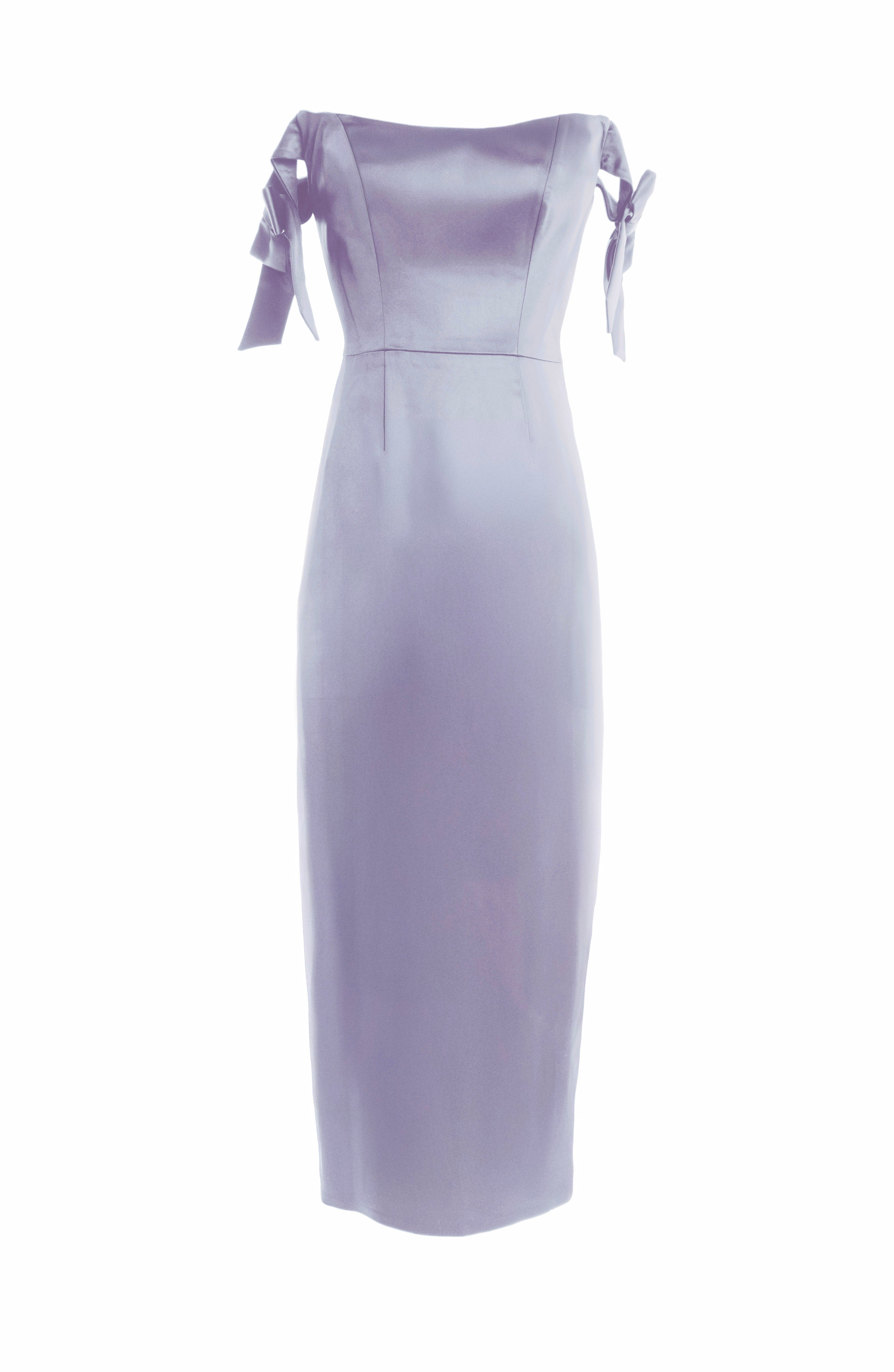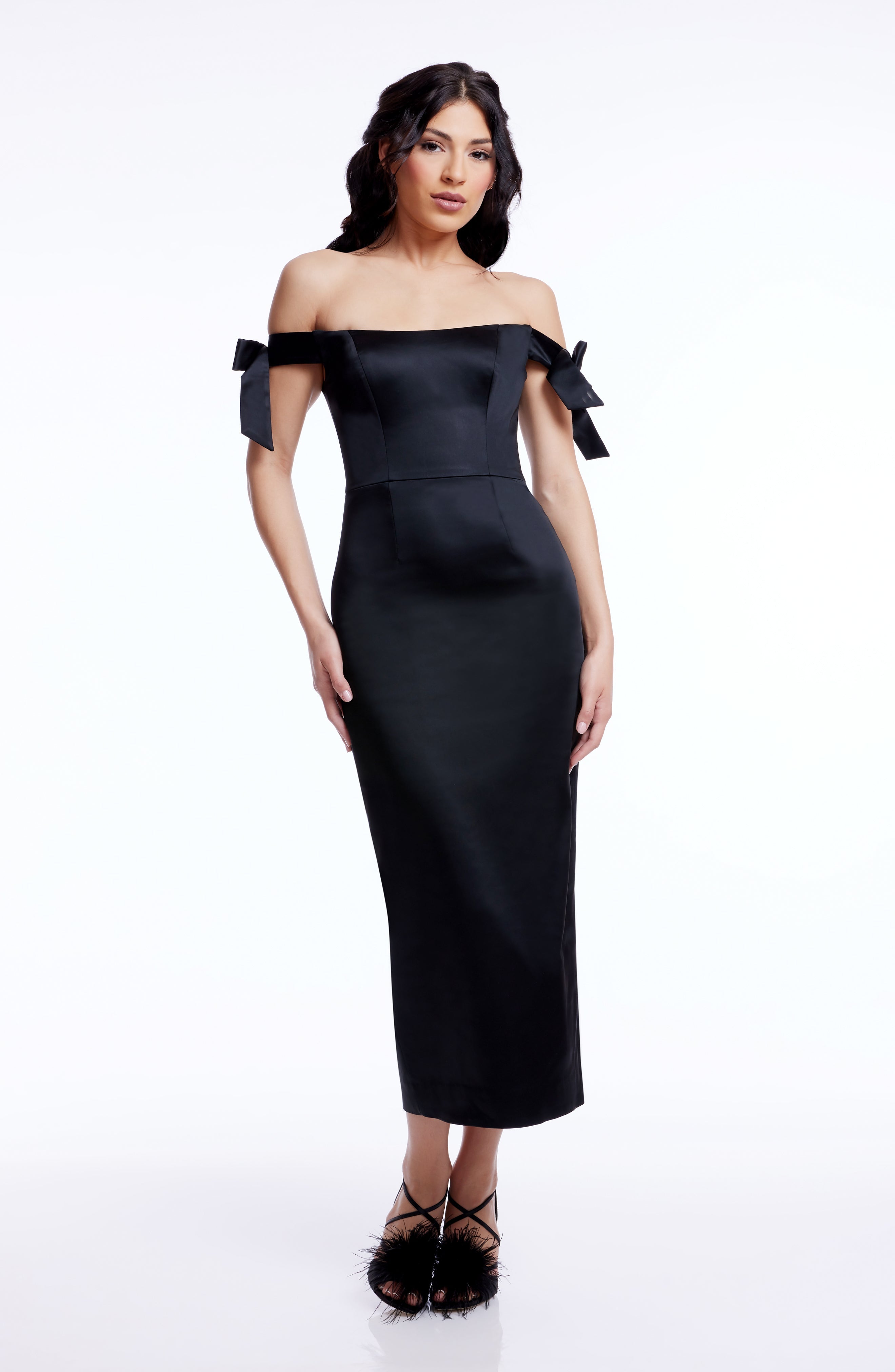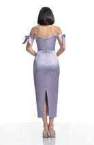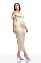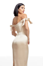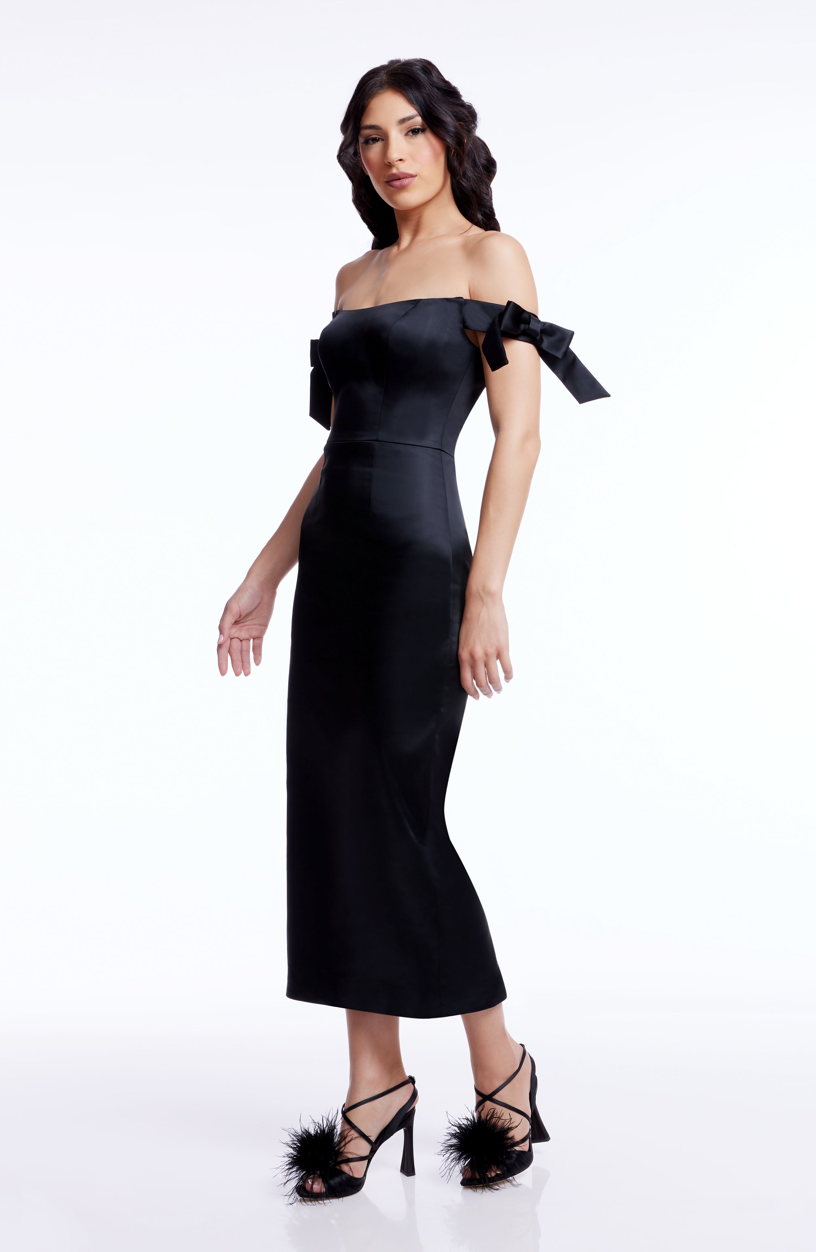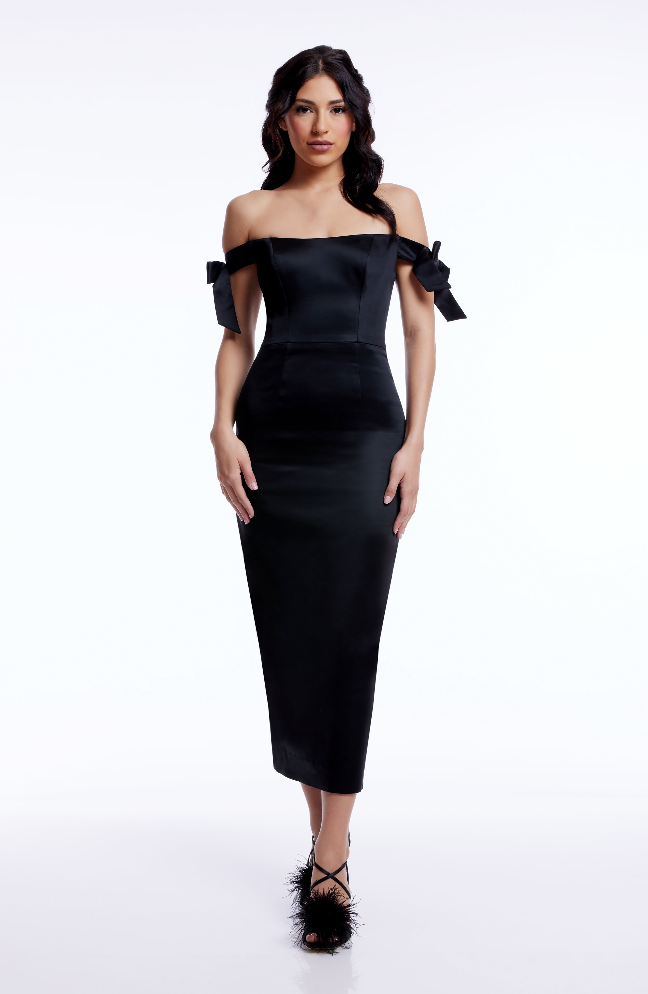 This Verona Dress features a strapless corset bodice adorned with bows, giving a flattering look. The tea length design offers a classy and feminine touch, making it perfect for any special occasion. The perfect choice for those who want to look effortlessly chic and elegant.