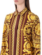 A TIMELESS EXPRESSION OF VERSACE’S VISUAL IDENTITY, THIS PURE SILK SHIRT SHOWCASES THE ICONIC BAROCCO MOTIF IN A RICH, SYMMETRICAL COMPOSITION. THE FLUID CONSTRUCTION ENHANCES ELEGANCE AND COMFORT, WHILE THE REFINED TAILORING ELEVATES THE SILHOUETTE. A SINGLE MEDUSA BUTTON HIGHLIGHTS THE CONCEALED PLACKET, ADDING A SIGNATURE TOUCH ROOTED IN THE MAISON’S HERITAGE.