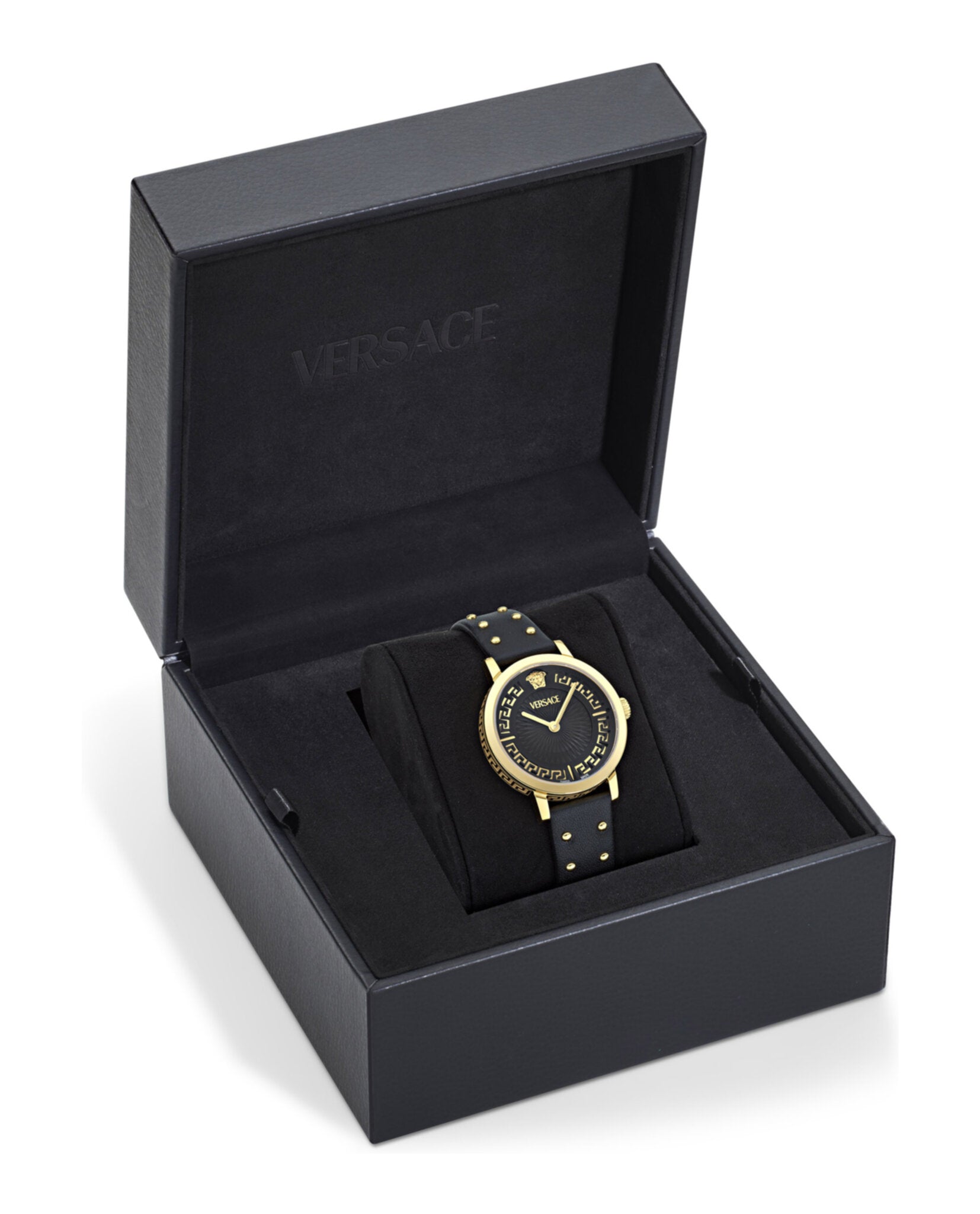 The Versace Greca Fortuna Leather Watch is a stunning timepiece that combines Italian luxury with Swiss precision. Featuring a 35mm IP yellow gold case and a sophisticated black guilloche dial adorned with the iconic Greca pattern, this watch exudes elegance and timeless style. The supple black calf leather strap with gold-tone studded detailing adds an edgy yet refined touch, making it perfect for both professional and social occasions.