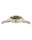 The striking green sunray dial adorned with Roman numerals and the iconic Versace Medusa logo exudes timeless elegance and modern style. Powered by a reliable Swiss-made 2-hand quartz movement, this watch offers both beauty and functionality with 5 ATM water resistance.