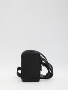 Vertical Cuerda crossbody bag in black nylon. It features a zip closure, an adjustable and removable fabric shoulder strap with a metal buckle, a black metal logo on the front, a flat exterior pocket, a single interior compartment, and a flat internal pocket. Dust bag included. Any imperfections in the material are not considered manufacturing defects but rather a characteristic of the material.