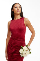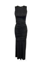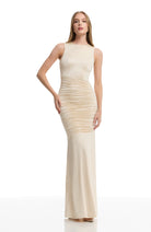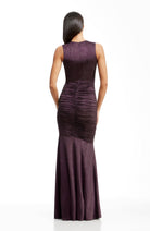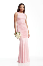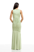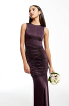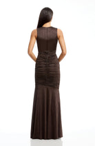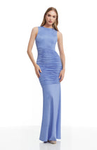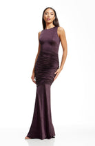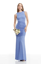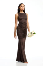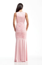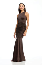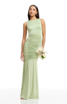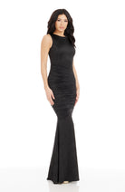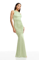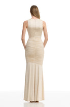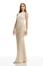 A sleeveless high-neck mermaid gown with ruched hips features a flattering silhouette for a sophisticated and elegant look.