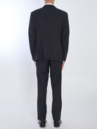TWO-PIECE SUIT IN DARK BLUE VIRGIN WOOL. THE JACKET FEATURES A SINGLE-BREASTED DESIGN WITH CLASSIC LAPELS AND A PIN ON THE COLLAR, FRONT BUTTON CLOSURE, TWO FRONT FLAP POCKETS, A WELT POCKET ON THE CHEST, AND BUTTONED CUFFS. THE TROUSERS HAVE STRAIGHT LEGS WITH A ZIP AND BUTTON CLOSURE, TWO SIDE POCKETS, TWO WELT BACK POCKETS WITH BUTTONS, AND BELT LOOPS. REGULAR FIT.