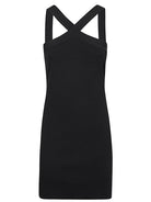 SHORT, BLACK, SOLID COLOR DRESS WITH WIDE CROSSOVER STRAPS AND STRAIGHT HEM.