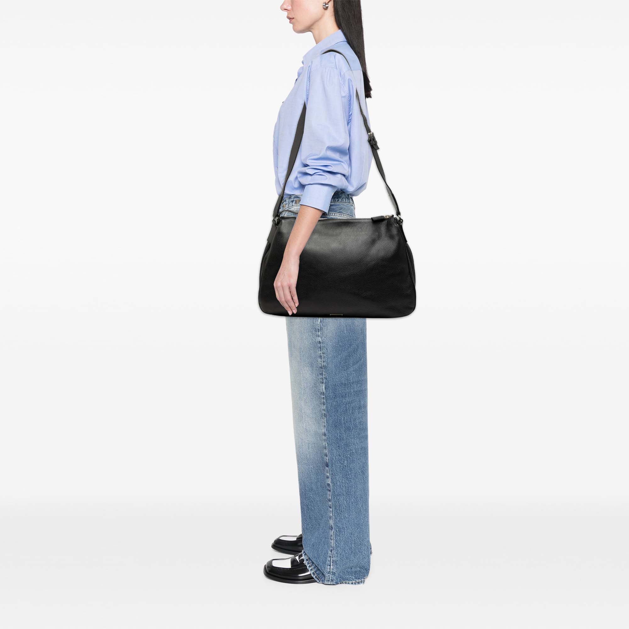 This crossbody bag features a leather body, an adjustable flat leather strap, a top zip closure, and an interior zip pocket.
