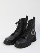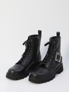 Black leather boots. Featuring front lacing, side strap with iconic buckle and RV signature, side zip closure, rear pull tab. Dustbag included. Any leather imperfections are not to be considered manufacturing defects, but a characteristic of the material.