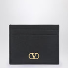 BLACK GRAINED LEATHER CARD HOLDER FEATURING GOLD-TONE VLOGO SIGNATURE ON THE FRONT, FOUR CARD SLOTS AND A CENTRAL SLOT.