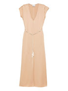 Elevate your warm-weather wardrobe with this stunning V-neck midi dress from Forte Forte. Crafted in a beautiful beige tone, this effortlessly chic piece features a flattering V-neckline and short sleeves for comfortable elegance. The distinctive tassel tie detail at the waist adds a touch of bohemian sophistication while creating a defined silhouette.
