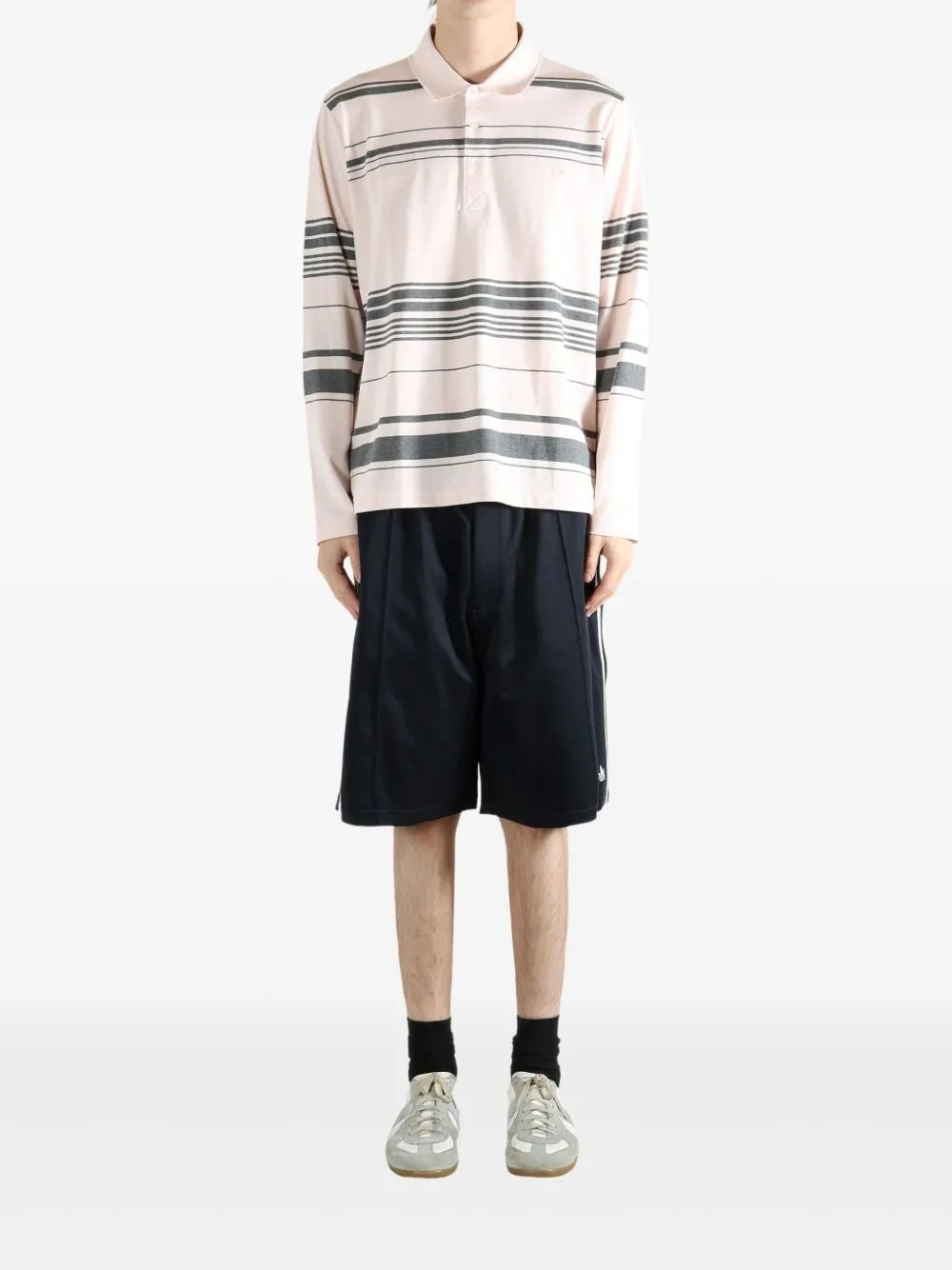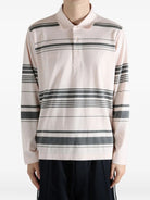 Elevate your casual wardrobe with the Wales Bonner Polo by adidas Originals. This distinctive long-sleeved polo features a sophisticated striped pattern in soft pink and charcoal tones, creating a refined yet relaxed aesthetic. The classic polo collar and button placket offer timeless appeal, while the oversized silhouette delivers contemporary comfort and style.