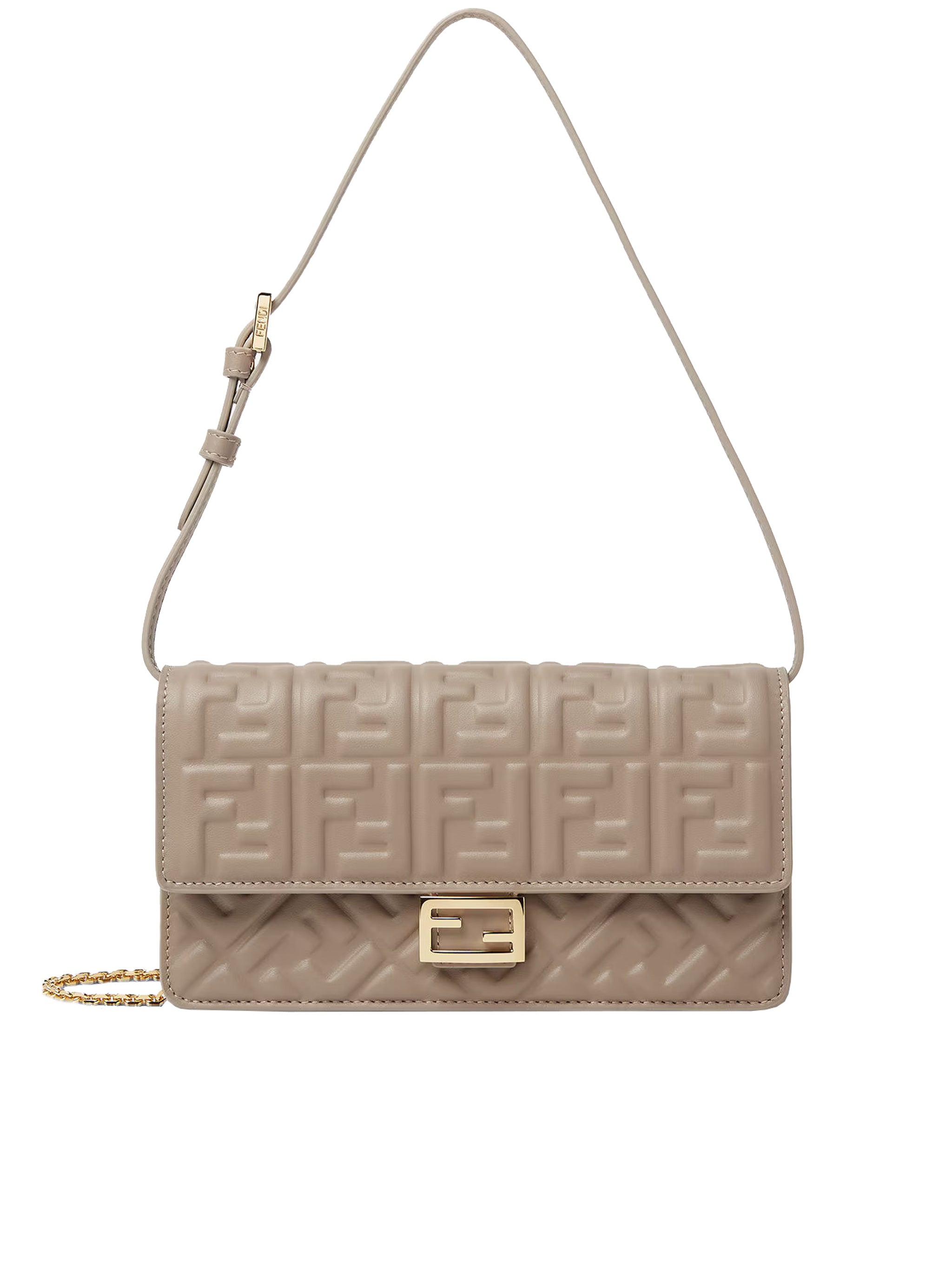 Elevate your accessory collection with this exquisite Fendi Wallet on Chain Baguette Shoulder Bag. Crafted in a sophisticated taupe hue, this iconic piece features the signature FF logo pattern beautifully embossed across the quilted leather, showcasing Fendi's legendary craftsmanship and attention to detail.