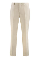 ELEGANT TROUSERS, CHARACTERIZED BY A FITTED SILHOUETTE AND A MODERN CUT. MADE WITH A SOFT AND VERSATILE FABRIC, THEY ARE SUITABLE FOR VARIOUS OCCASIONS, FROM WORK TO LEISURE. THEY FEATURE TWO SIDE POCKETS AND A CLOSURE WITH A ZIP AND BUTTON. THE COMFORTABLE FIT OFFERS EXCELLENT FREEDOM OF MOVEMENT, MAKING THEM AN ESSENTIAL PIECE IN YOUR WARDROBE. PERFECT TO MATCH WITH SHIRTS AND JACKETS FOR A SOPHISTICATED LOOK.