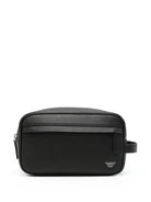BLACK FAUX LEATHER TEXTURED FINISH SINGLE FLAT SIDE HANDLE FRONT ZIP-FASTENING COMPARTMENT SILVER-TONE LOGO PLAQUE TWO ZIP-FASTENING COMPARTMENTS INTERNAL CARD SLOTS INTERNAL SLIP POCKET FULL LINING TOP ZIP FASTENING
