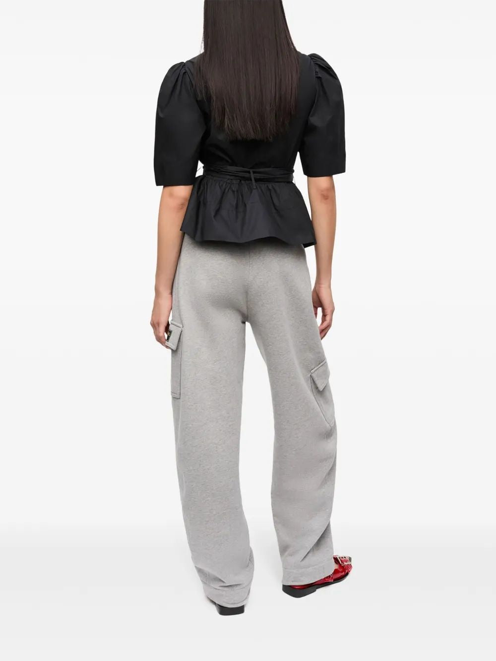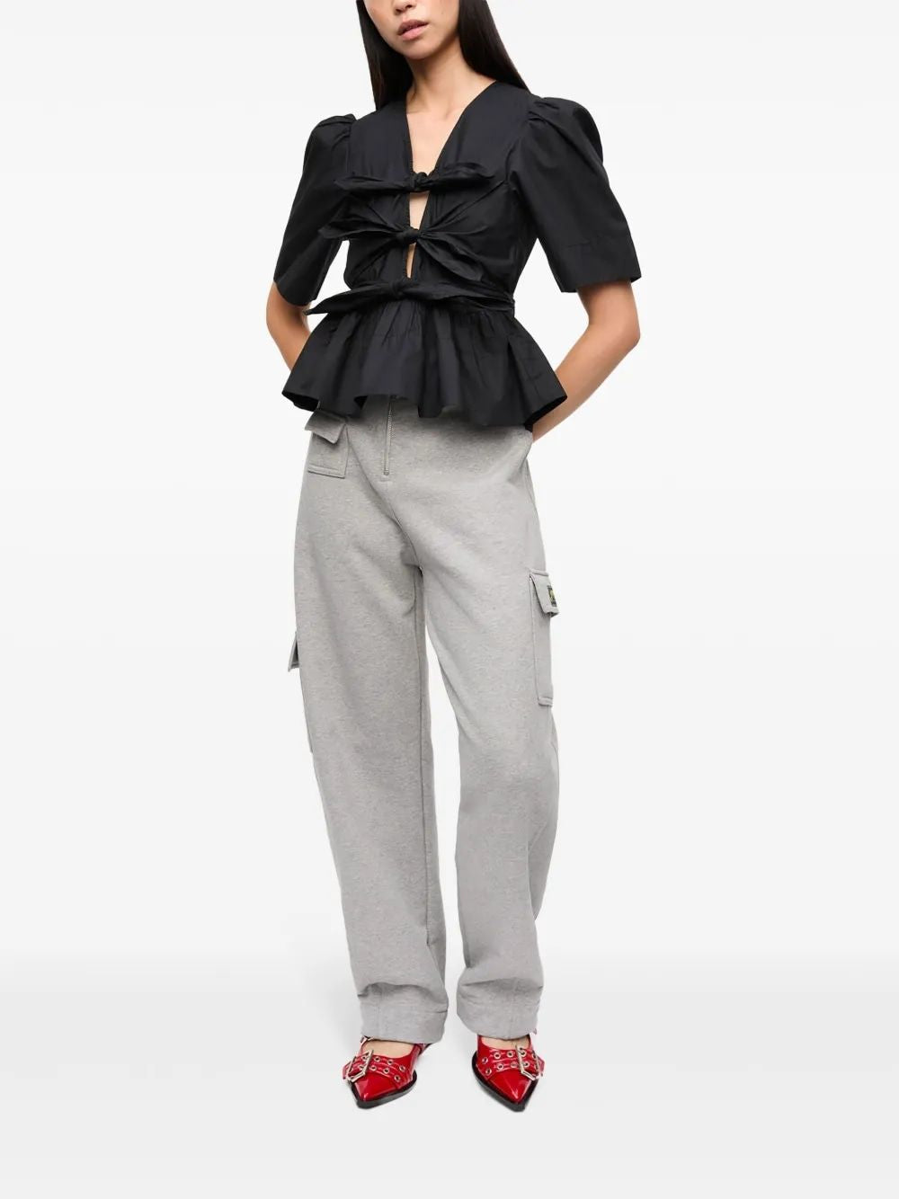 Elevate your everyday wardrobe with the Washed Tie Strap Blouse from Ganni. This striking black blouse features dramatic tie strap detailing across the bodice, creating a unique corset-inspired look that's both modern and feminine.