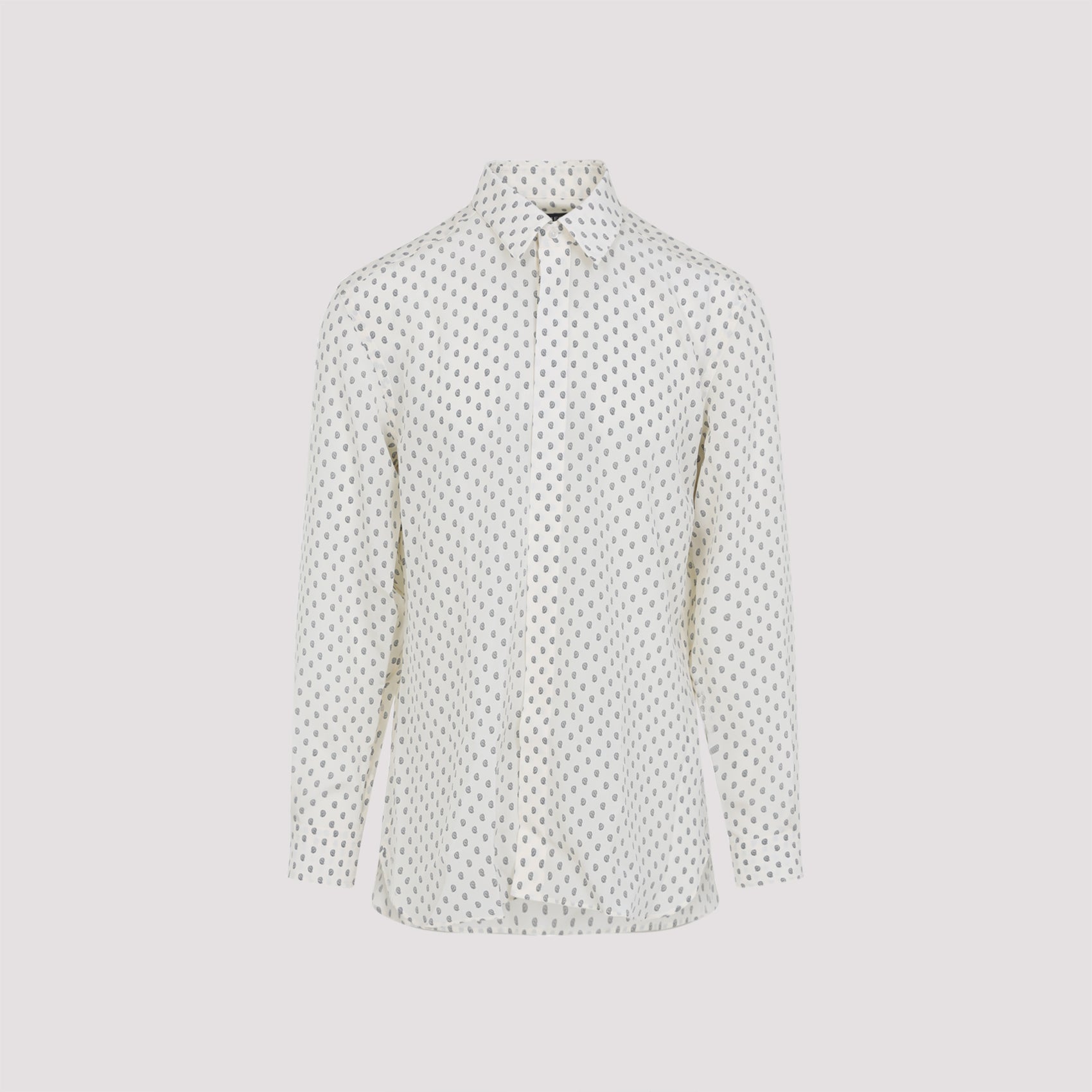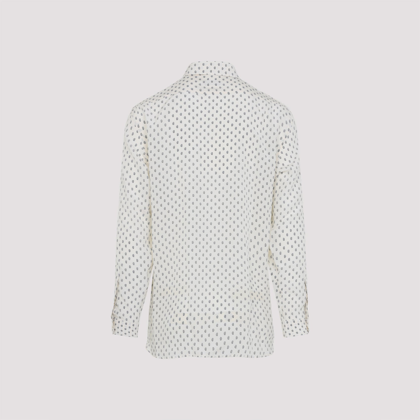 Elevate your wardrobe with this exquisite Tom Ford fluid silk shirt in white and blue. Crafted from luxurious white crepe de chine silk, this sophisticated piece features an elegant blue micro print throughout that adds subtle visual interest.