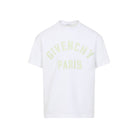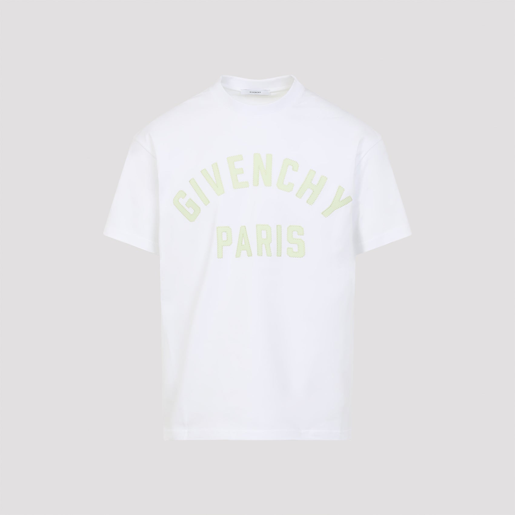 GIVENCHY WHITE AND GREEN COTTON T-SHIRT. PURE WHITE COTTON T-SHIRT, ROUND NECK, FRONT GREEN TONAL LETTERING LOGO, SHORT SLEEVES, TONAL STITCHING, STRAIGHT HEM.