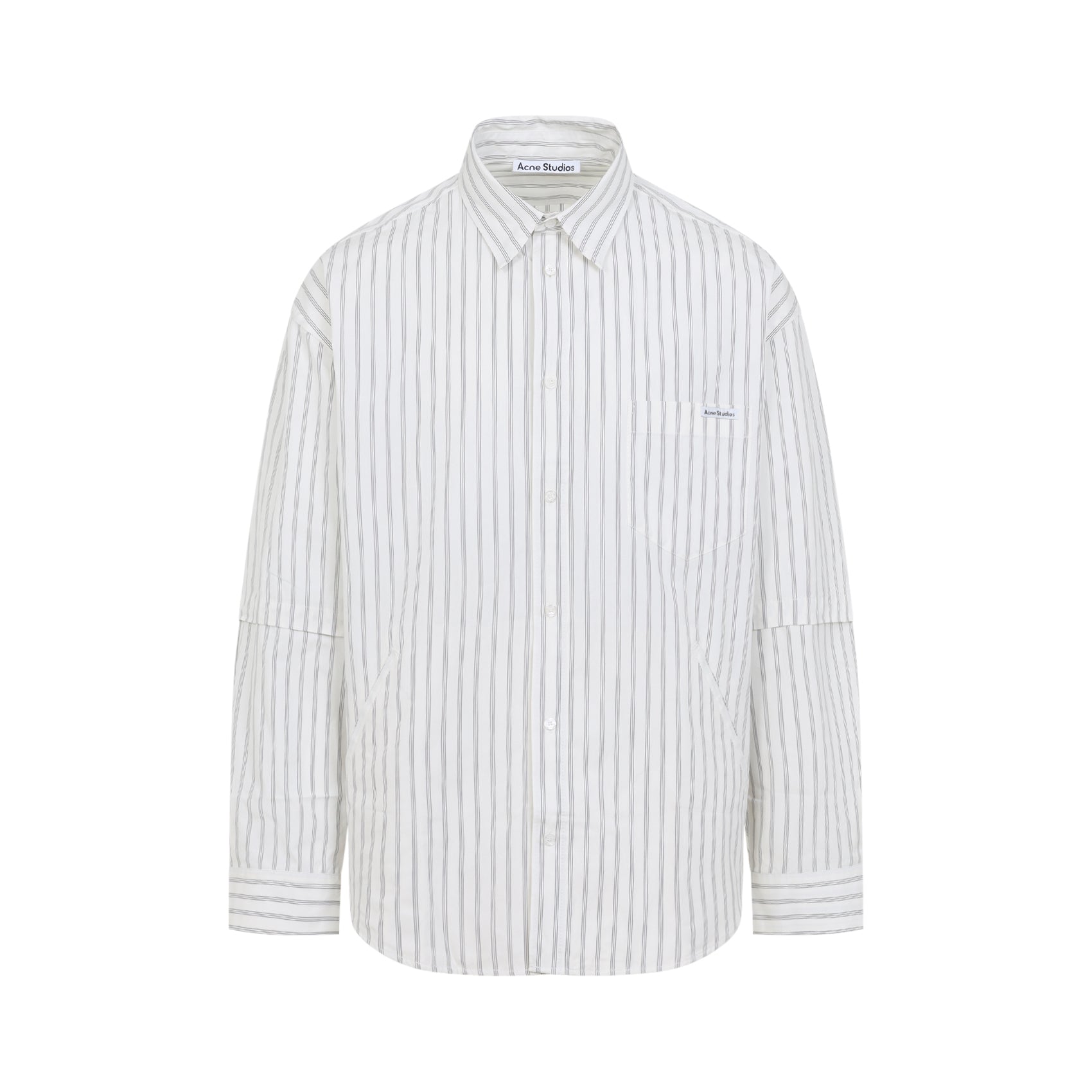 ACNE STUDIOS DOUBLE SLEEVE WHITE AND GREY COTTON SHIRT. RAFTED FROM WHITE AND GREY COTTON POPLIN WITH AN ALL-OVER STRIPED PATTERN, FEATURING A POINTED COLLAR, FRONT BUTTON FASTENING, A PATCH POCKET WITH BRANDED LABEL DETAIL ON THE CHEST, DROPPED SHOULDERS, DOUBLE-LAYER CONSTRUCTION SLEEVES, BUTTONED CUFFS, A BACK YOKE, A ROUNDED HEM, AND A RELAXED FIT.