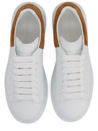 Elevate your everyday style with these luxurious Alexander McQueen white calf skin sneakers. Crafted from premium 100% calf leather and made in Italy, these iconic low-top sneakers feature a clean white design with contrasting tan heel tabs and a signature oversized sole.