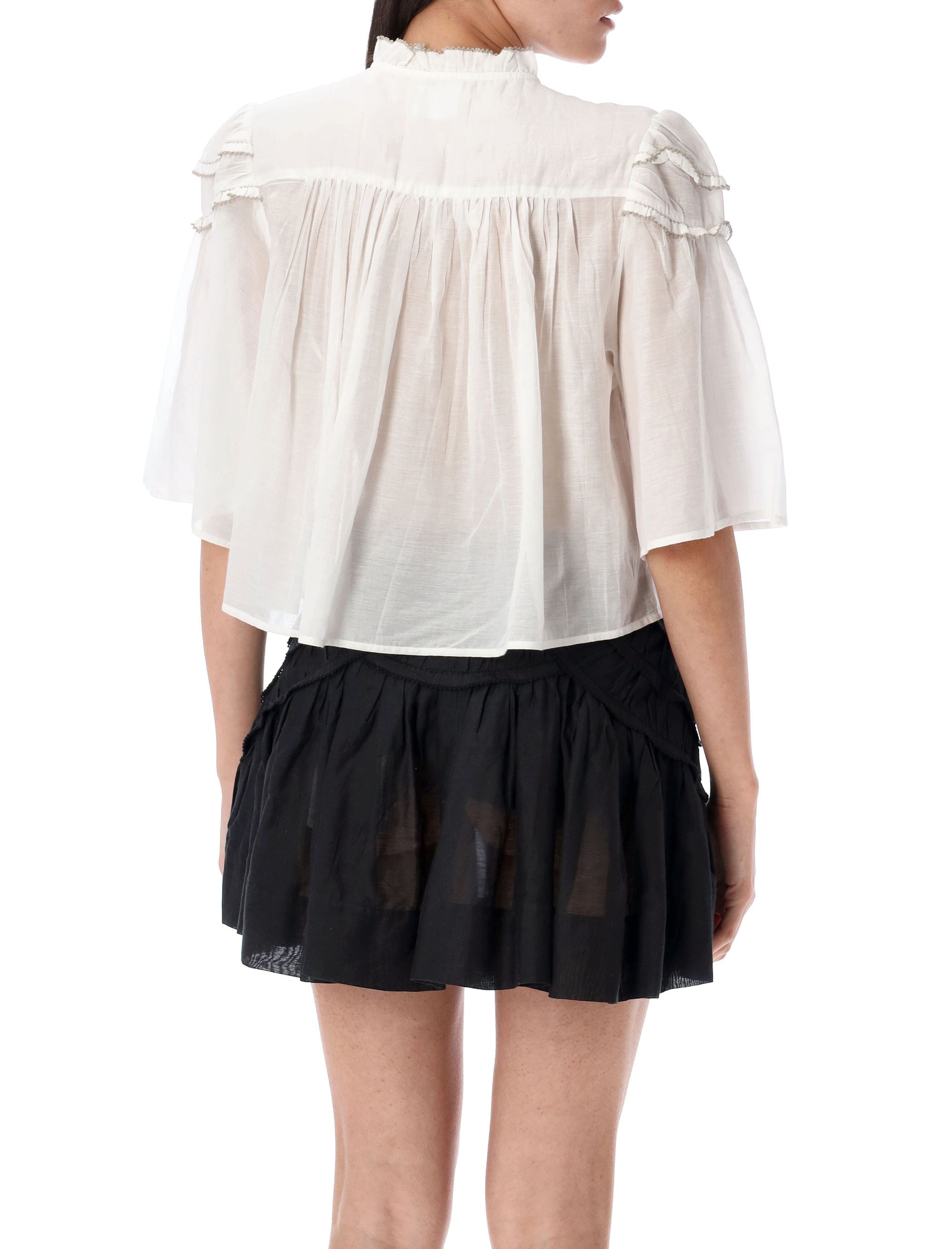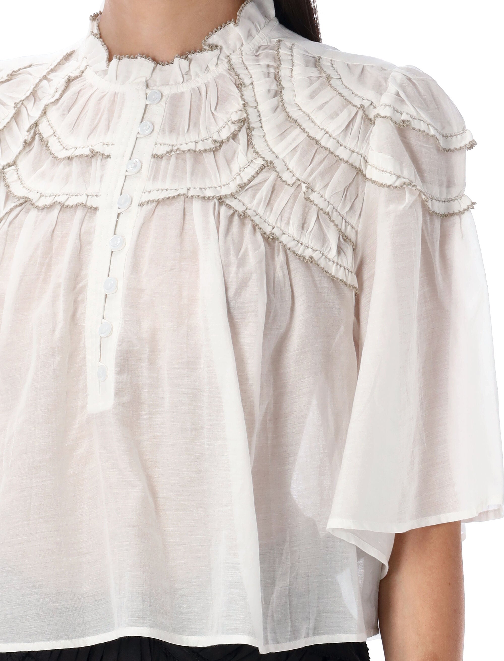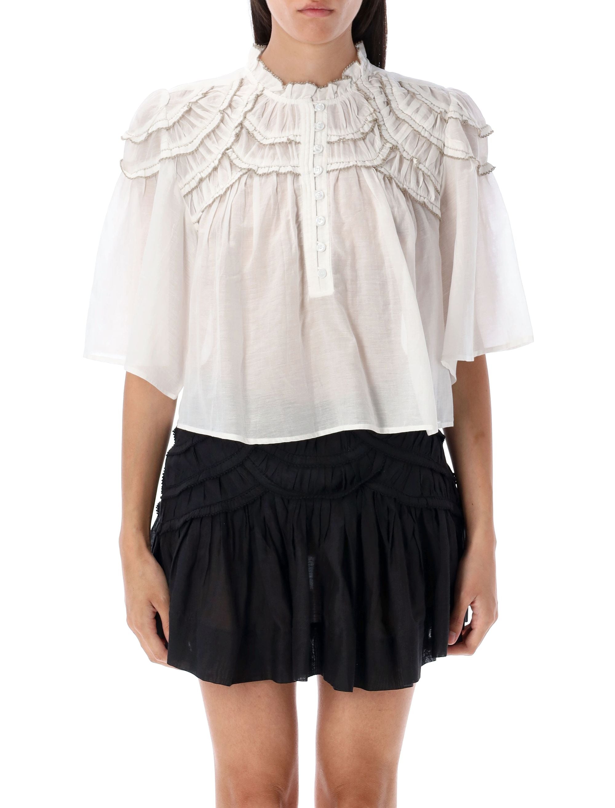 Elevate your wardrobe with this exquisite White Cotton Blend Carmen Top from Isabel Marant Etoile. This sophisticated blouse features romantic ruffle detailing around the neckline and shoulders, creating a feminine and elegant silhouette.