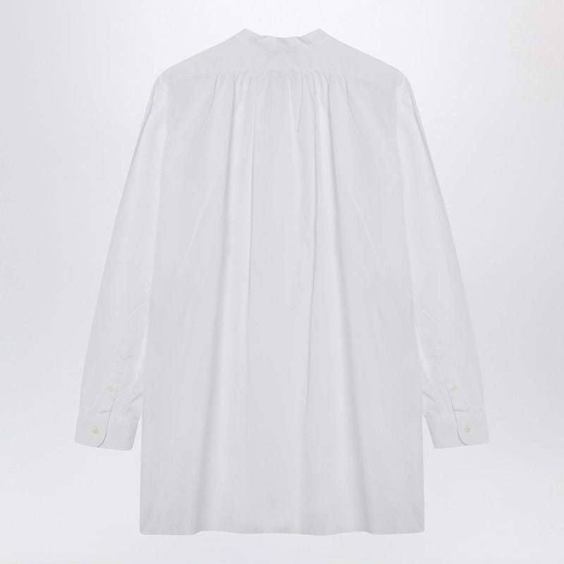 Elevate your everyday wardrobe with this sophisticated white cotton canvas shirt by Prada. Featuring a refined mandarin collar and front button closure, this piece effortlessly blends classic tailoring with contemporary design elements. The pleated front detail adds textural interest, while the long sleeves with buttoned cuffs provide a polished finish.